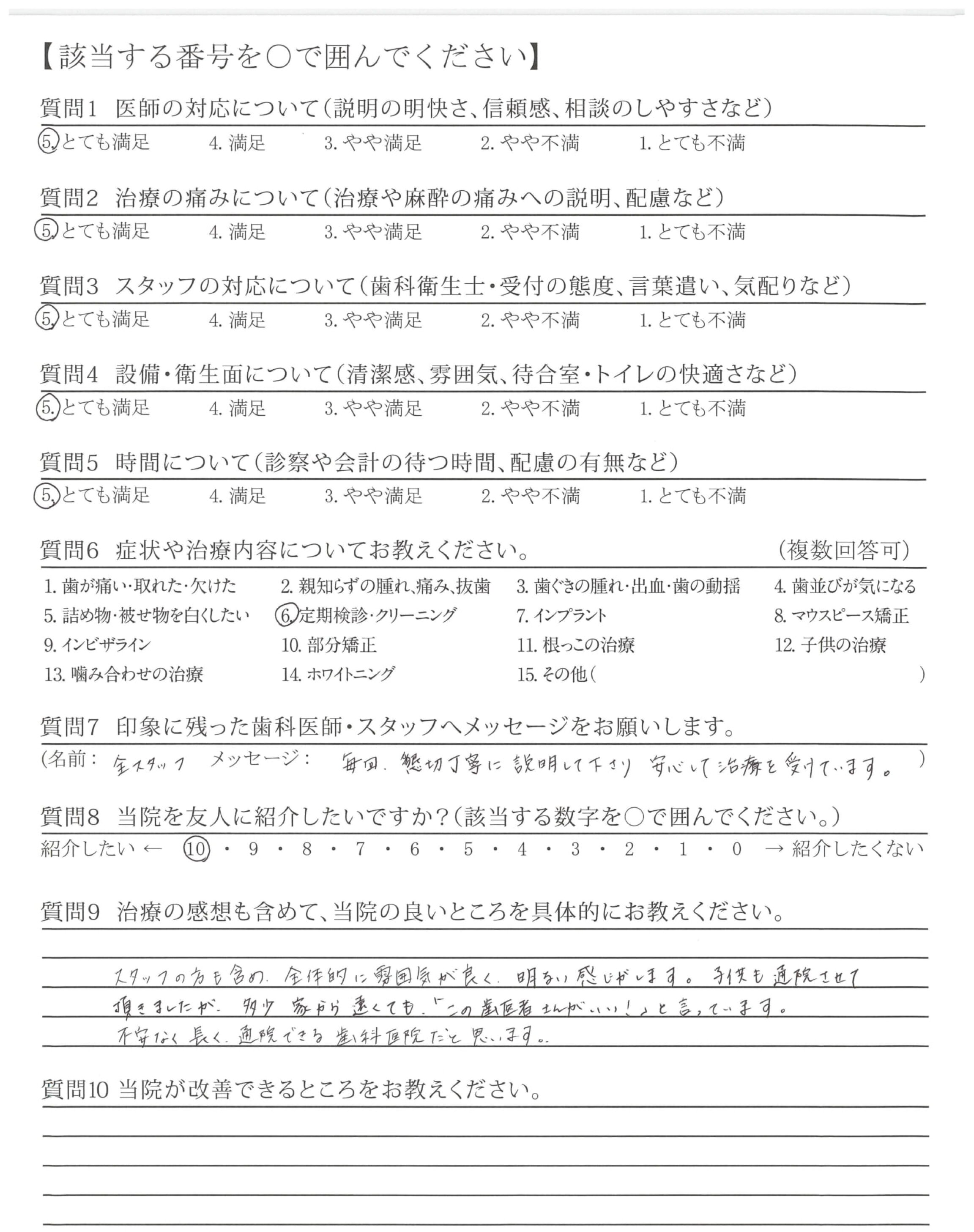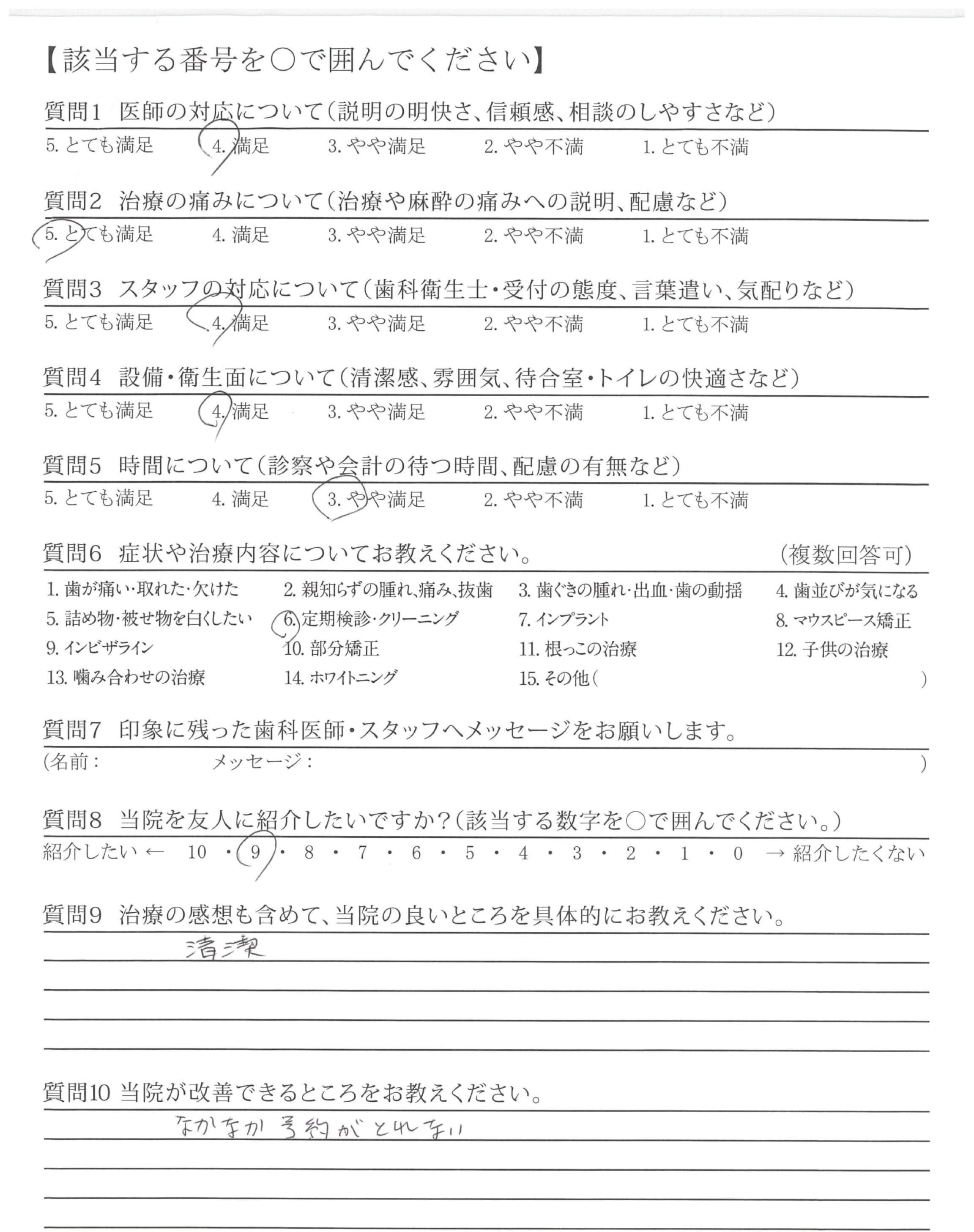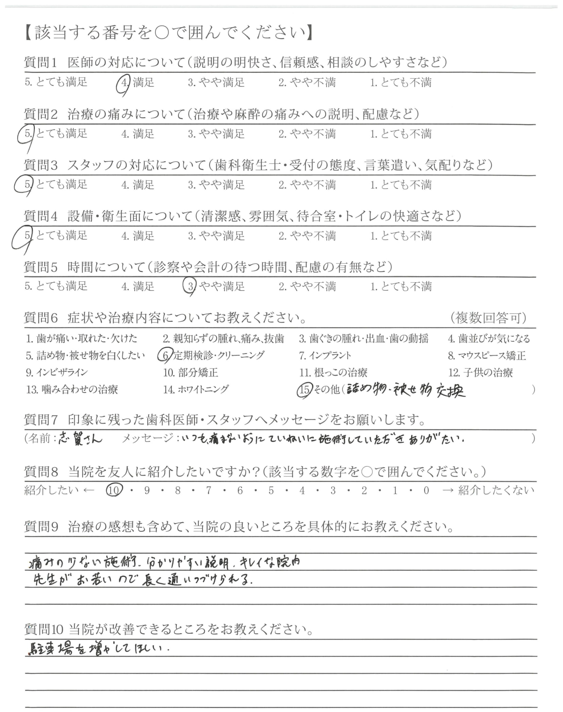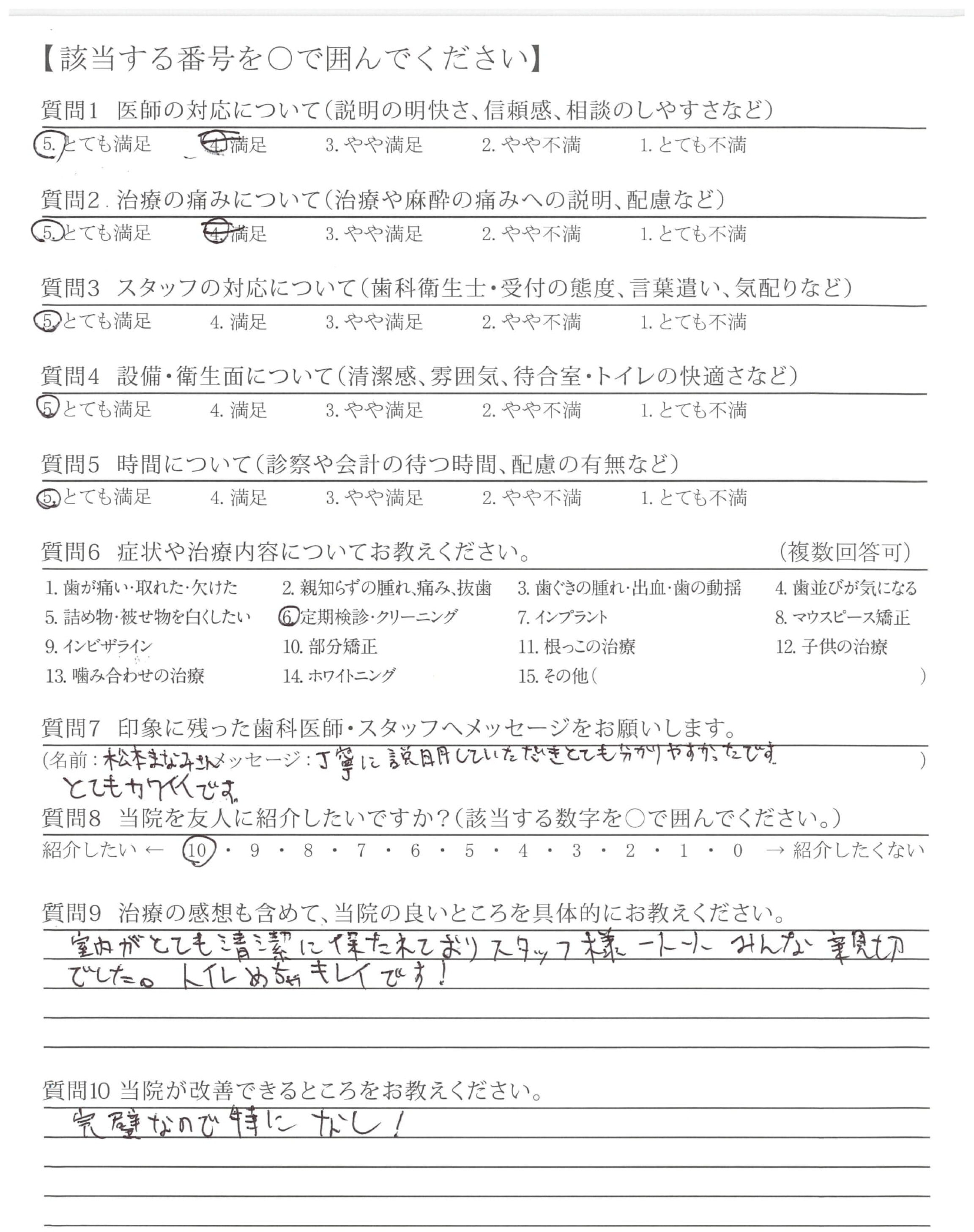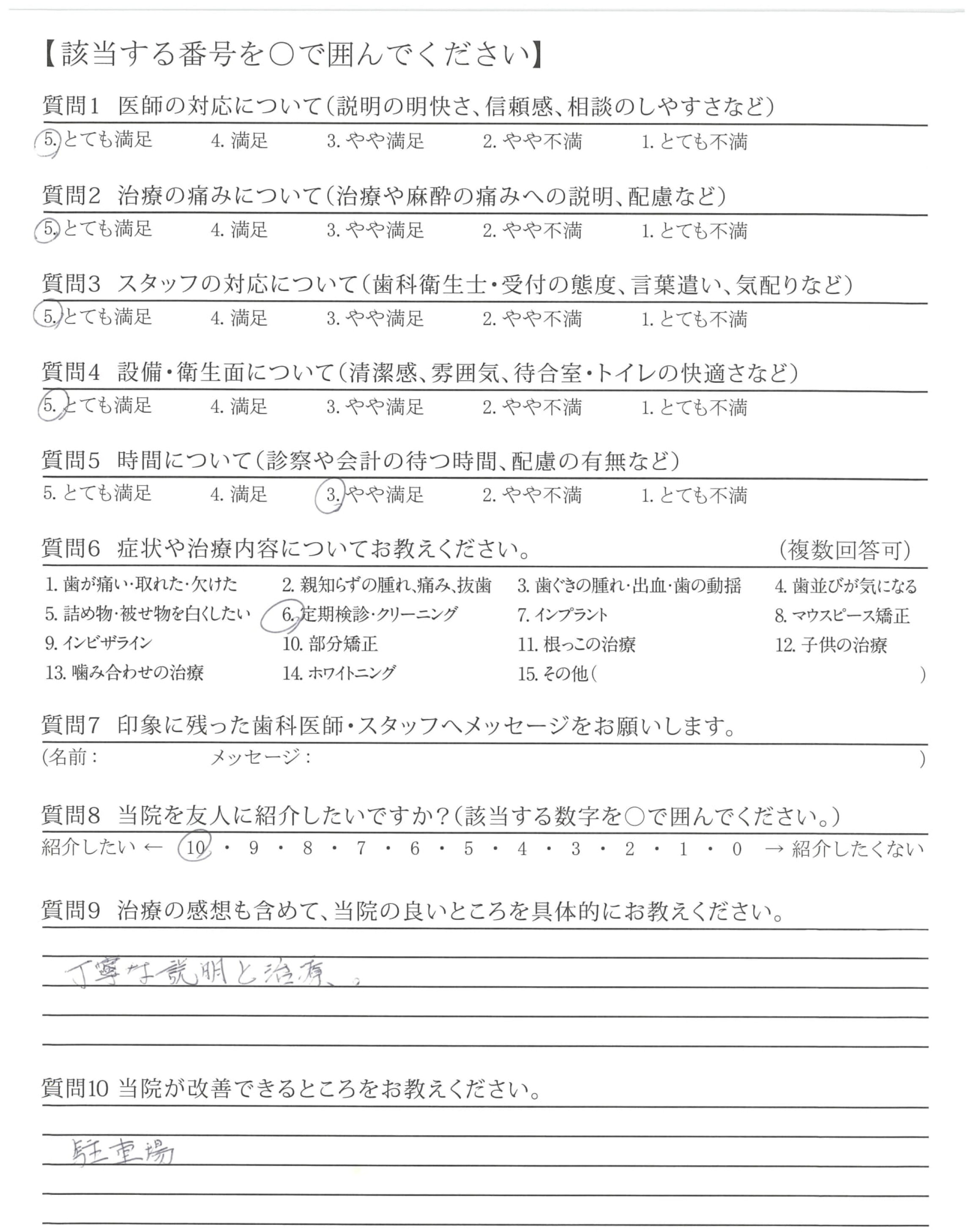 自分が今までイメージしていた歯医者さんと違い、何かあったらまたお世話になりたいです。痛みも感じることなく治療ができました。