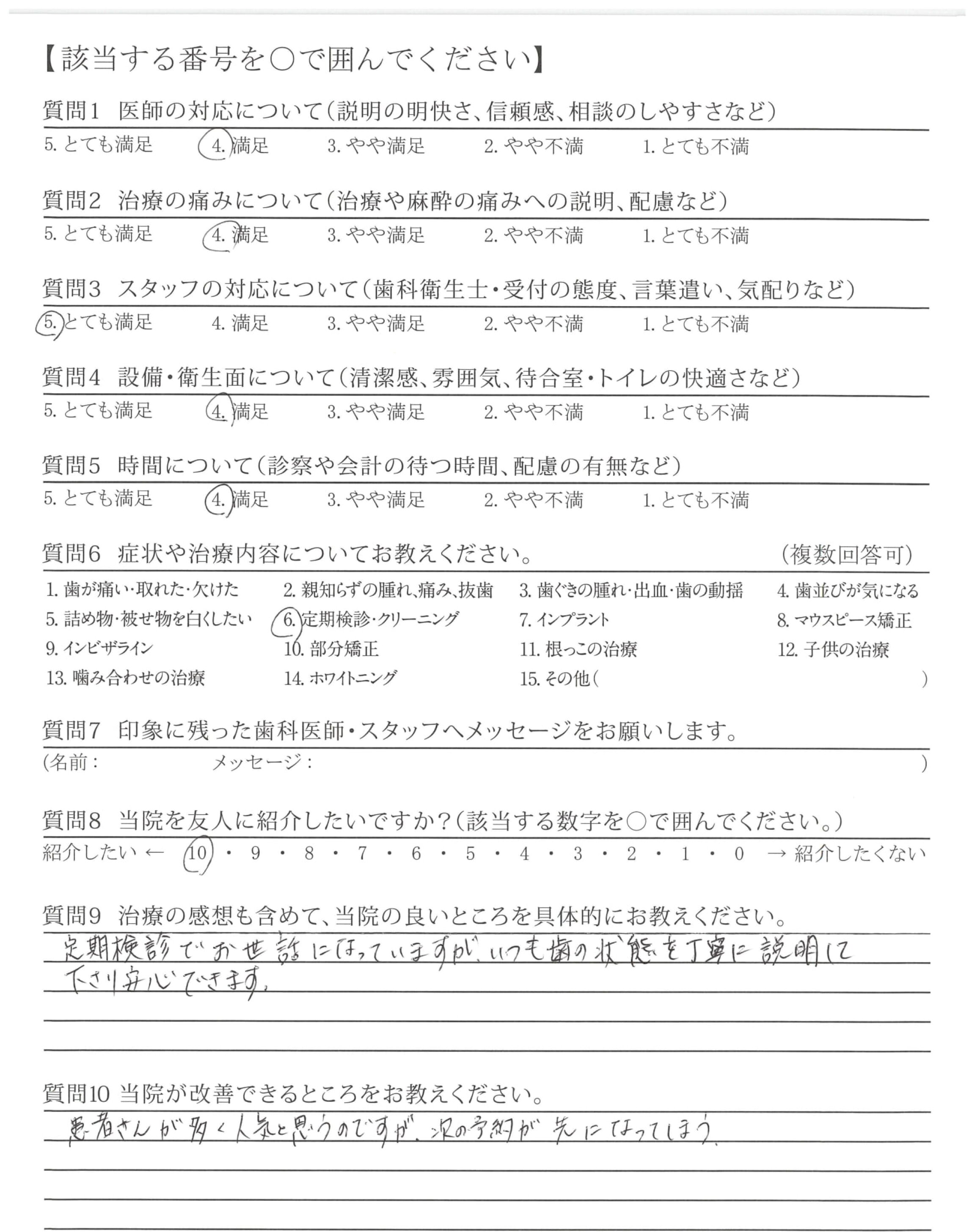 毎回、懇切丁寧に説明して下さり安心して治療を受けています。
