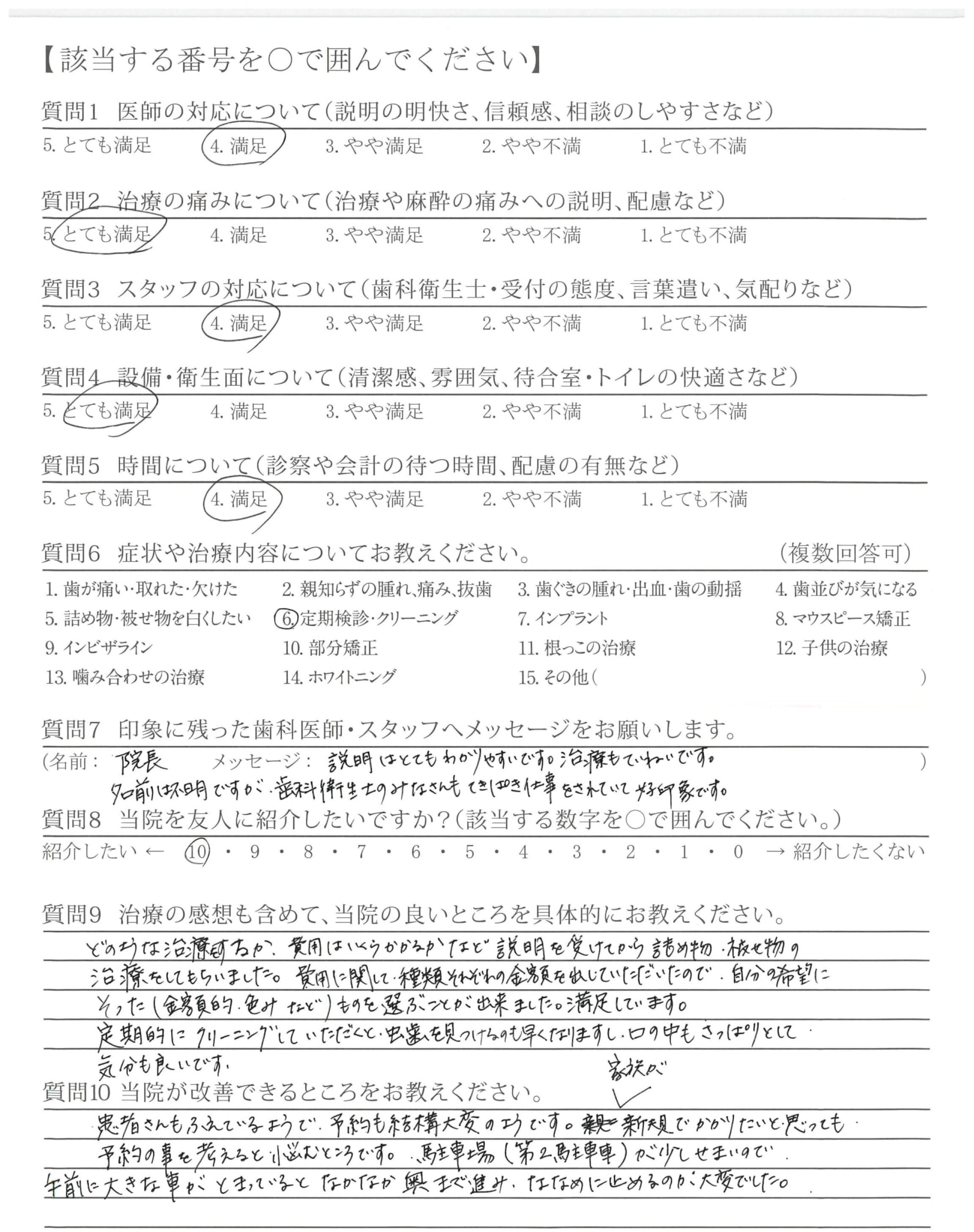 私は、こちらのクリニックに通う前は定期検診などは怠っていて、その場しのぎで治療をしてもらっていました。65才を過ぎて前歯が突然欠けてしまい「どうしよう~」と不安いっぱいで初診しました。院長が現在の状態をきちんと話してくれたのですが、結構なショックを受けました。しかし治療を進める上で説明、提案、確認があるので、不安から少しづつ安心感が出てきます。年令的な問題だけではないですが定期検診やクリーニングは大切だと思います。