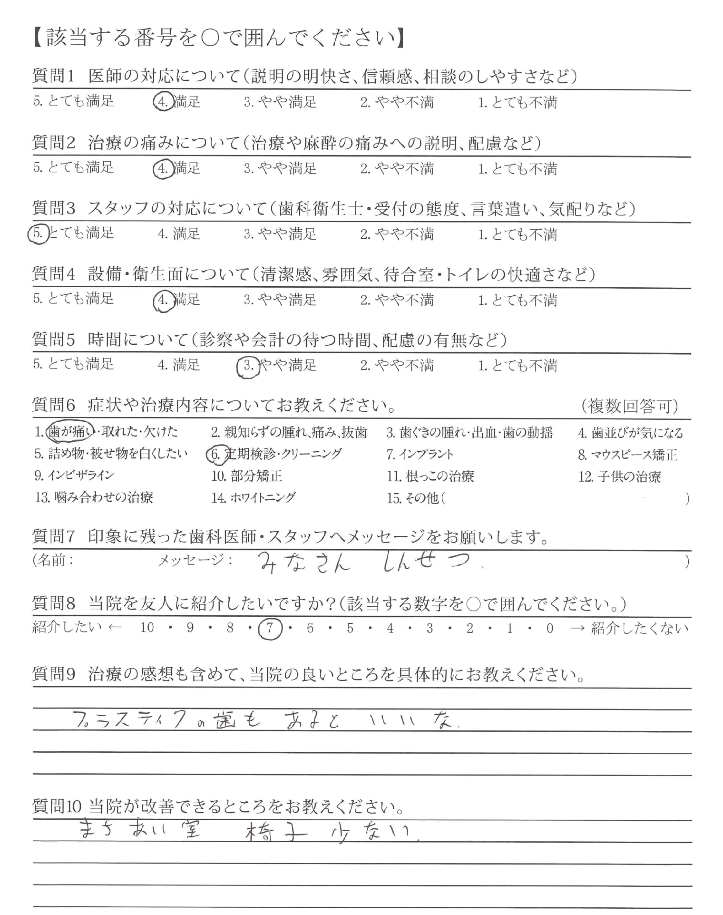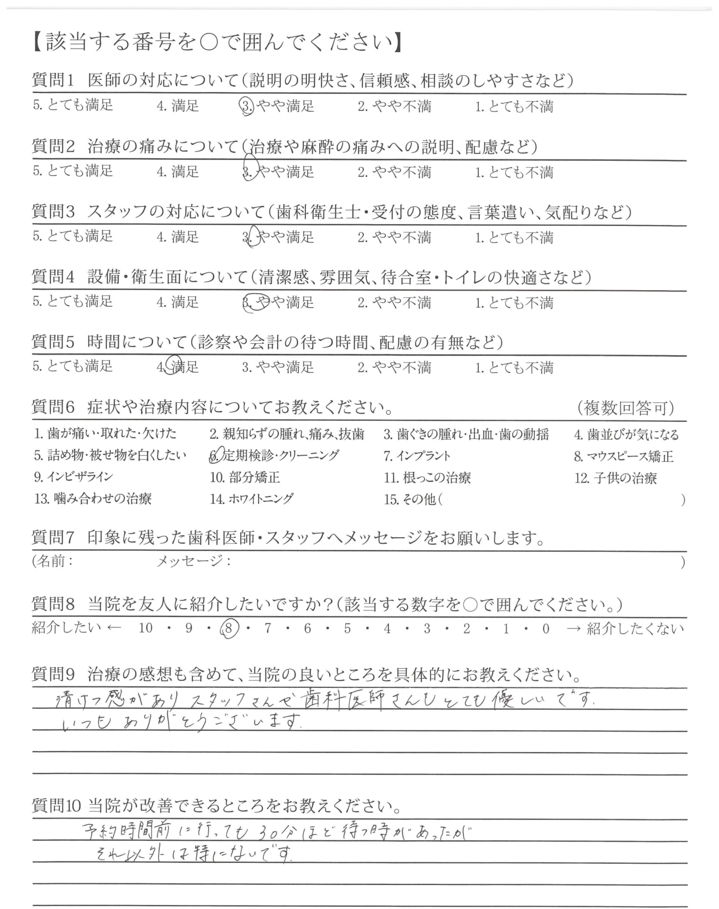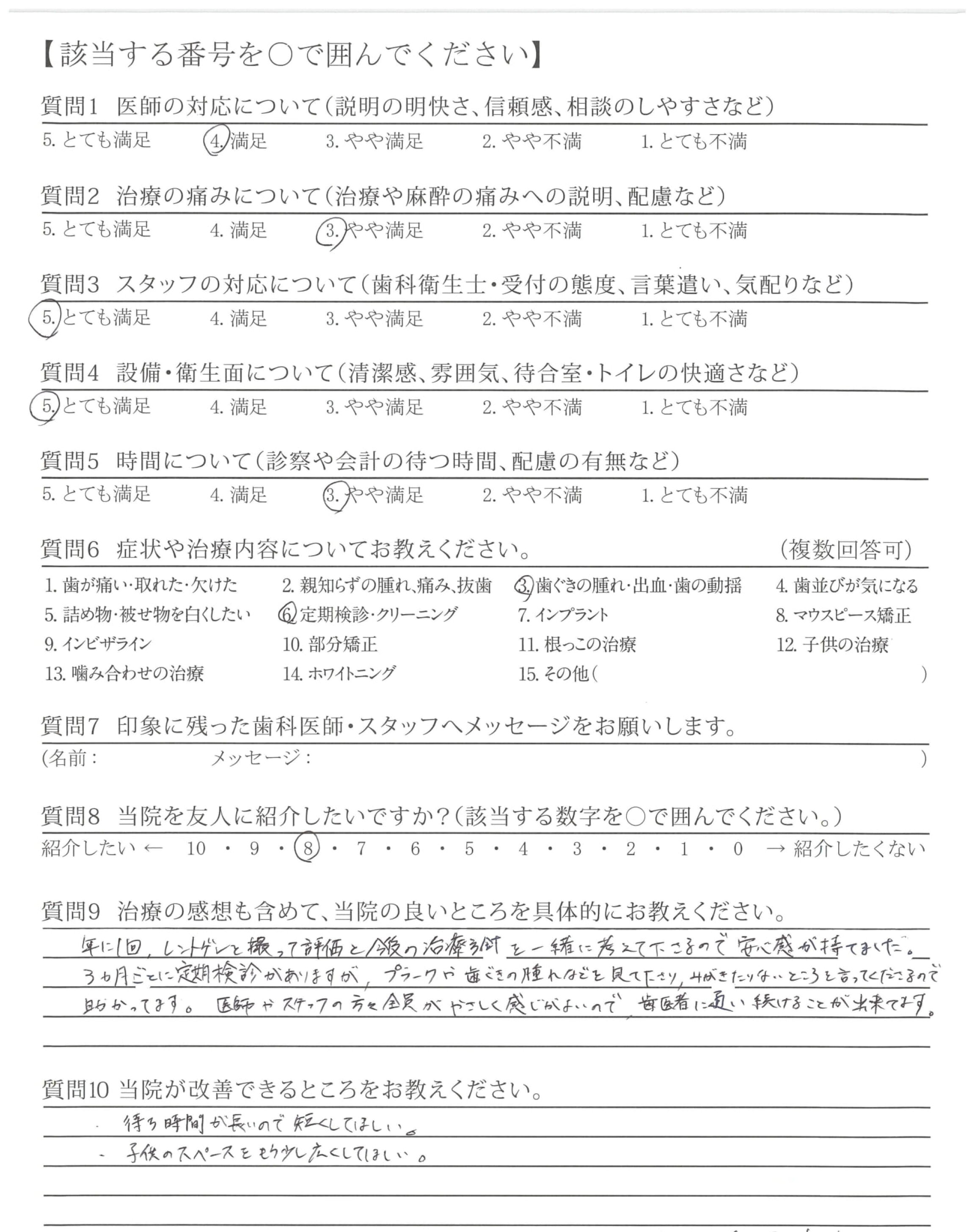 3ヵ月ごとに定期検診がありますが、プラークや歯ぐきの腫れなどを見て下さり、みがきたりないところを言ってくださるので助かってます。