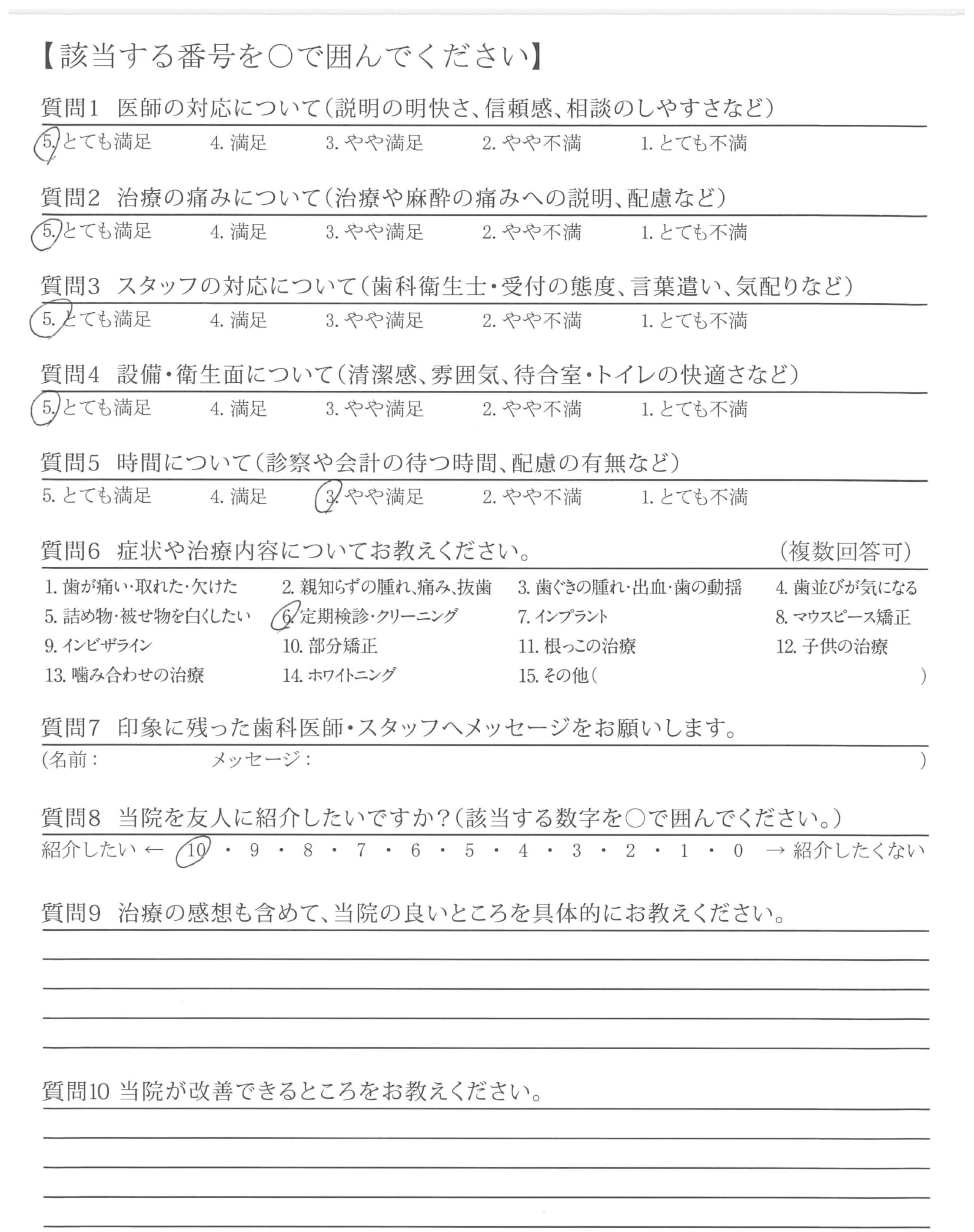 当サイトに掲載しているアンケートは、第三者機関である日本歯科医療評価機構が医院の協力を得て直接患者さんへ調査を行ったもので、医院では操作のできない客観的な評価です。毎週患者さんから届くアンケート結果を集計し、このページを更新しています。