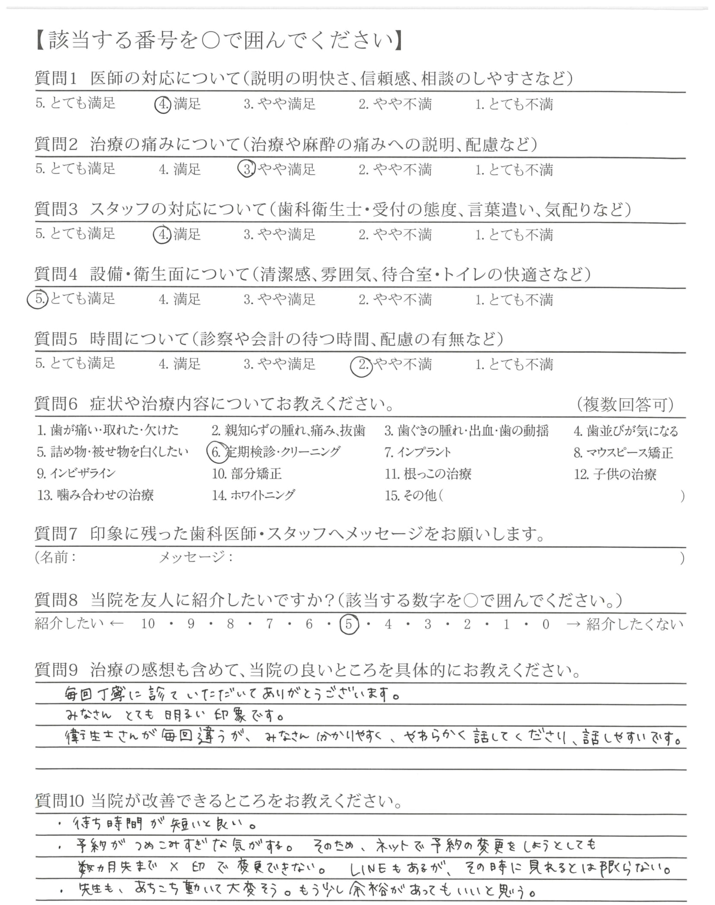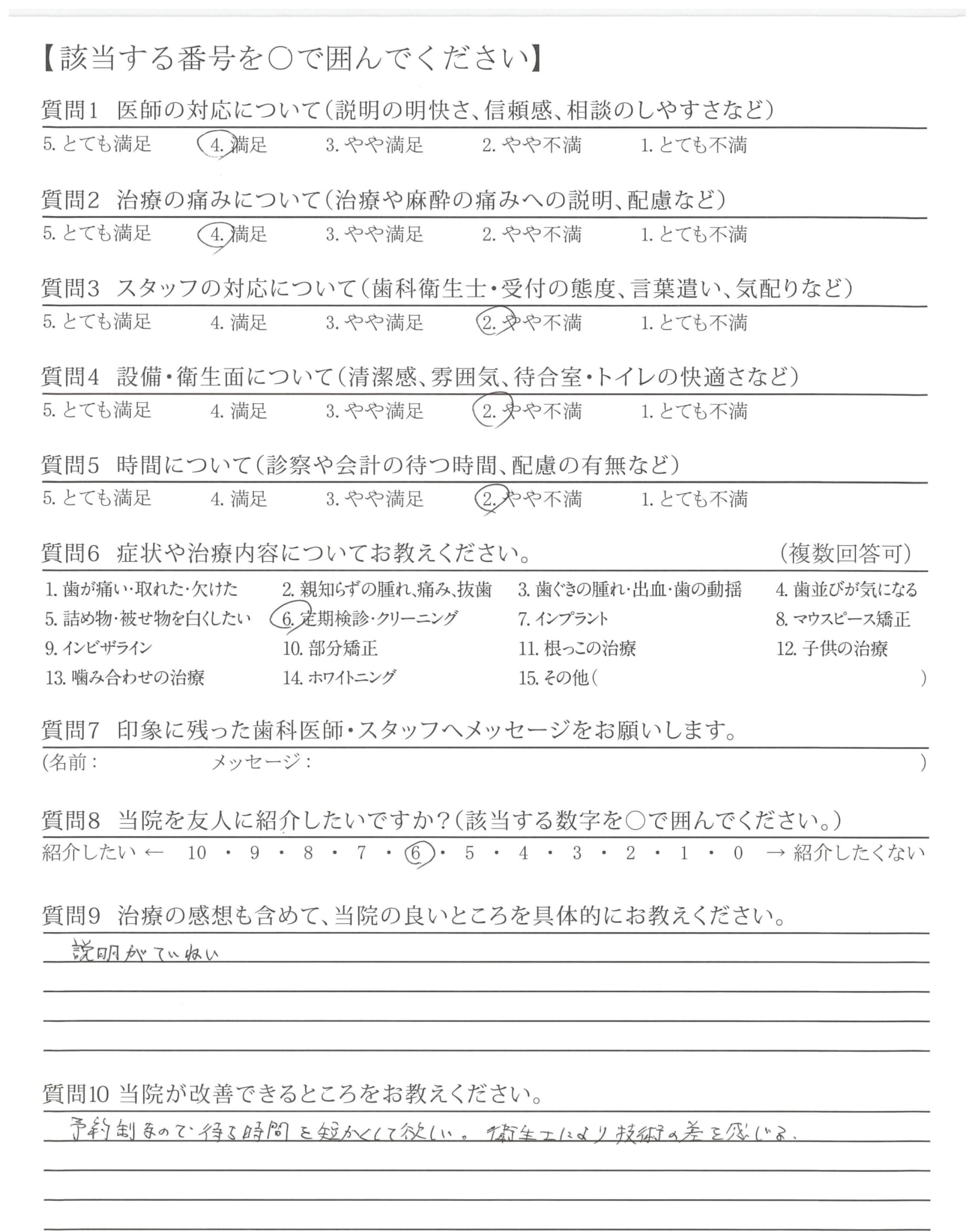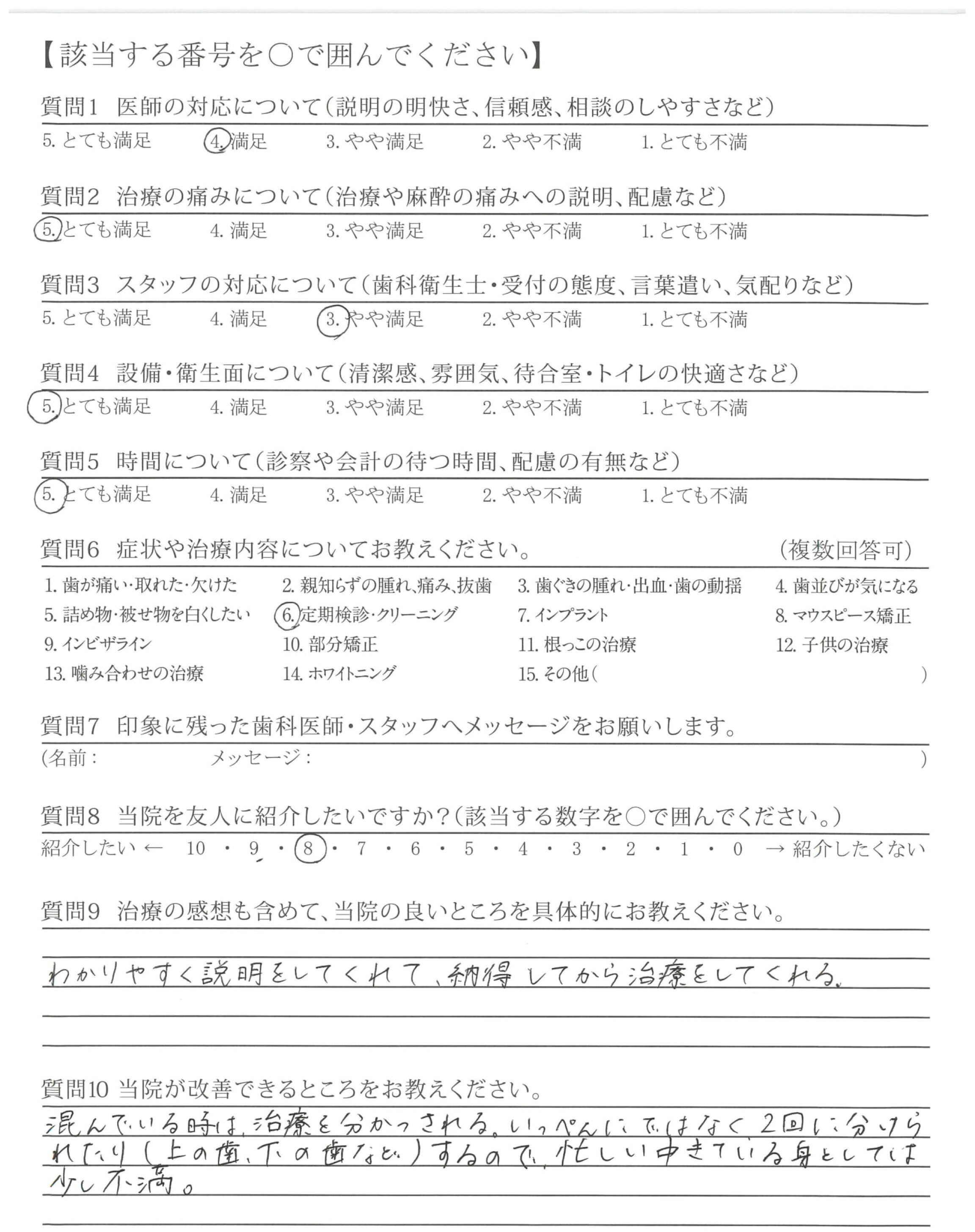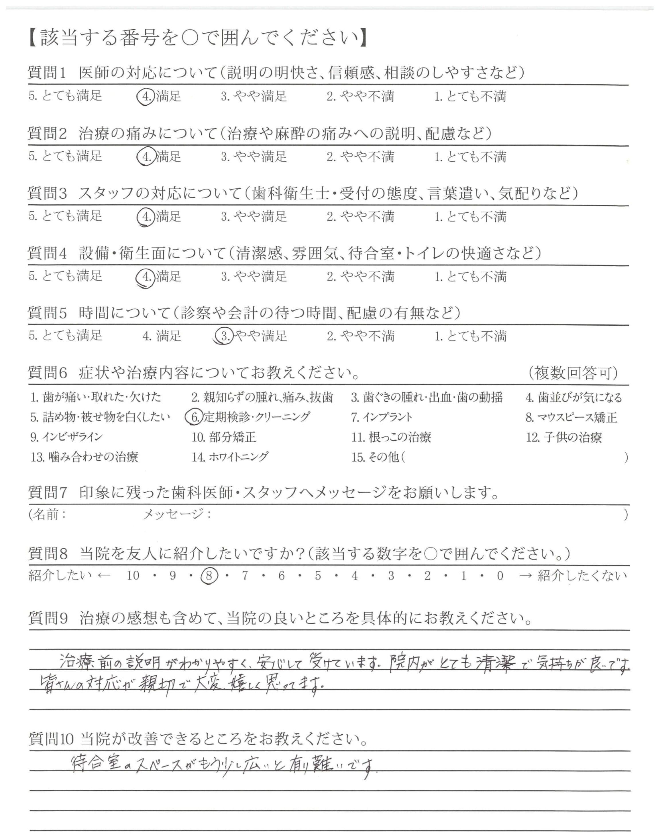衛生士さんが毎回違うが、みなさん分かりやすく、やわらかく話してくださり、話しやすいです。
