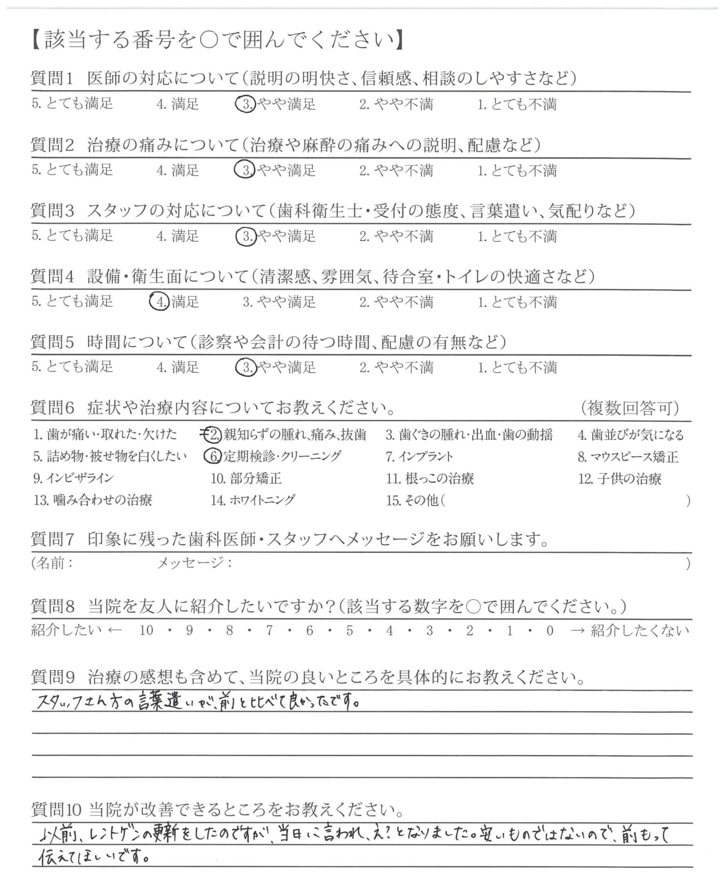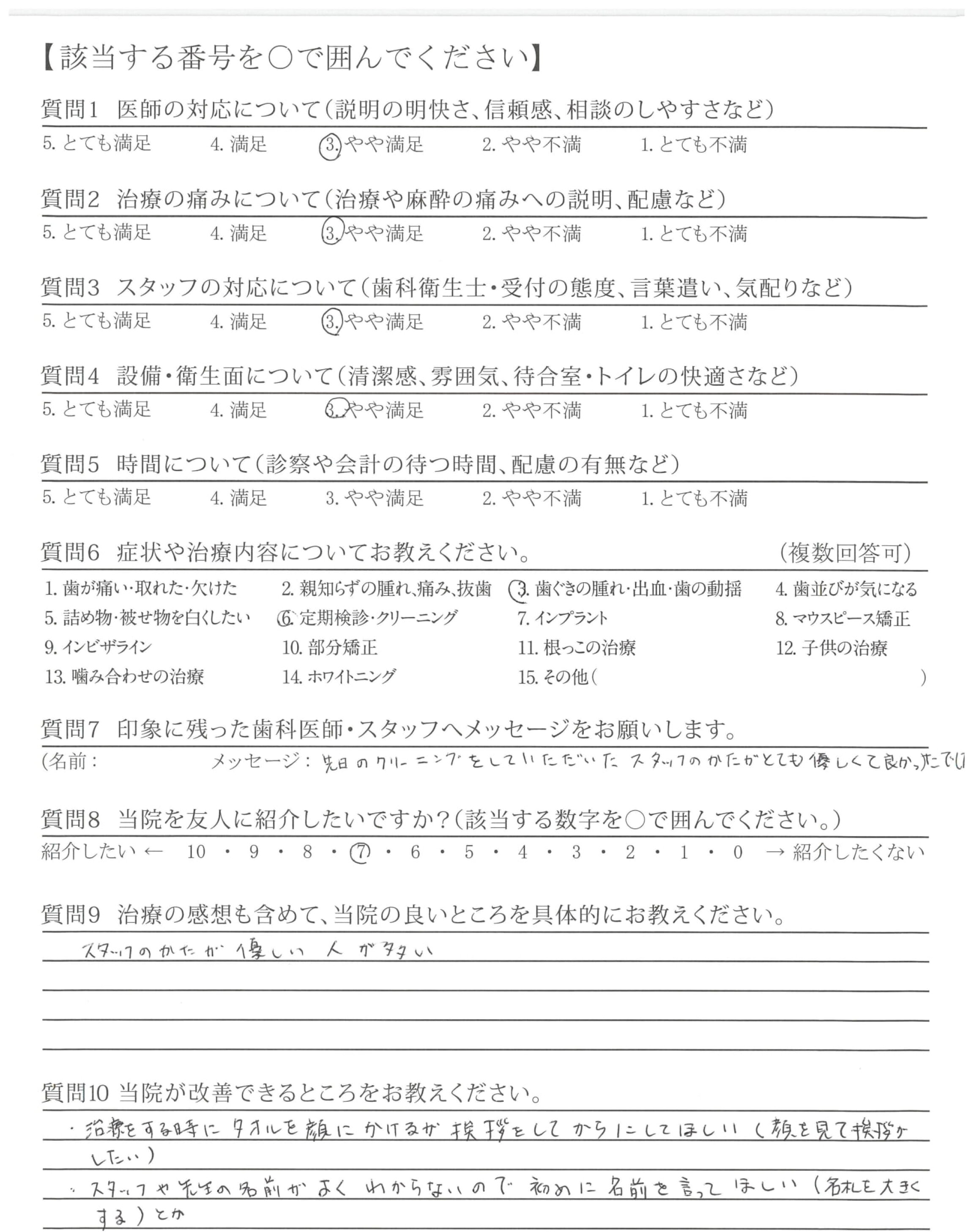 ・治療をする時にタオルを顔にかけるが挨拶をしてからにしてほしい(顔を見て挨拶がしたい)
