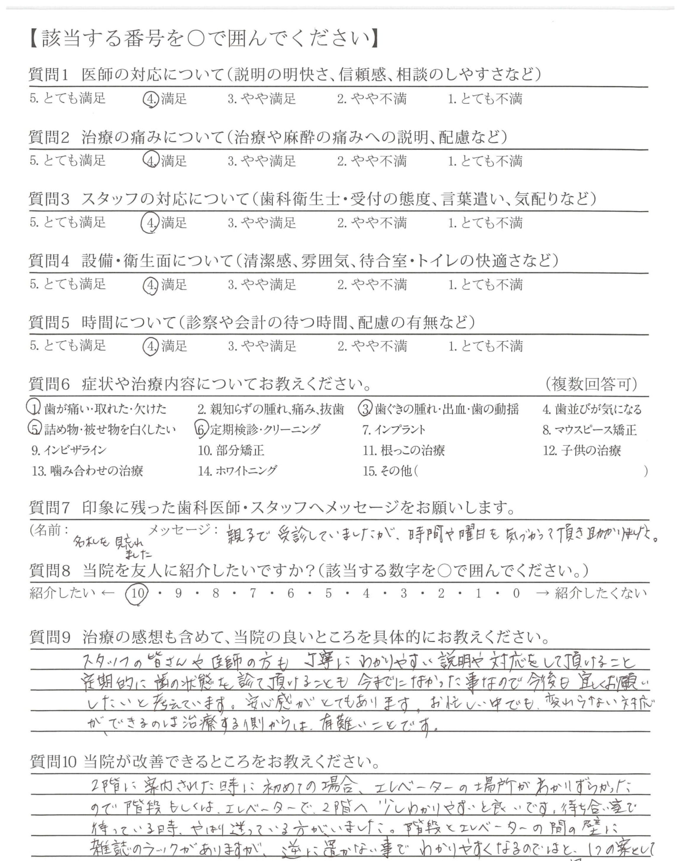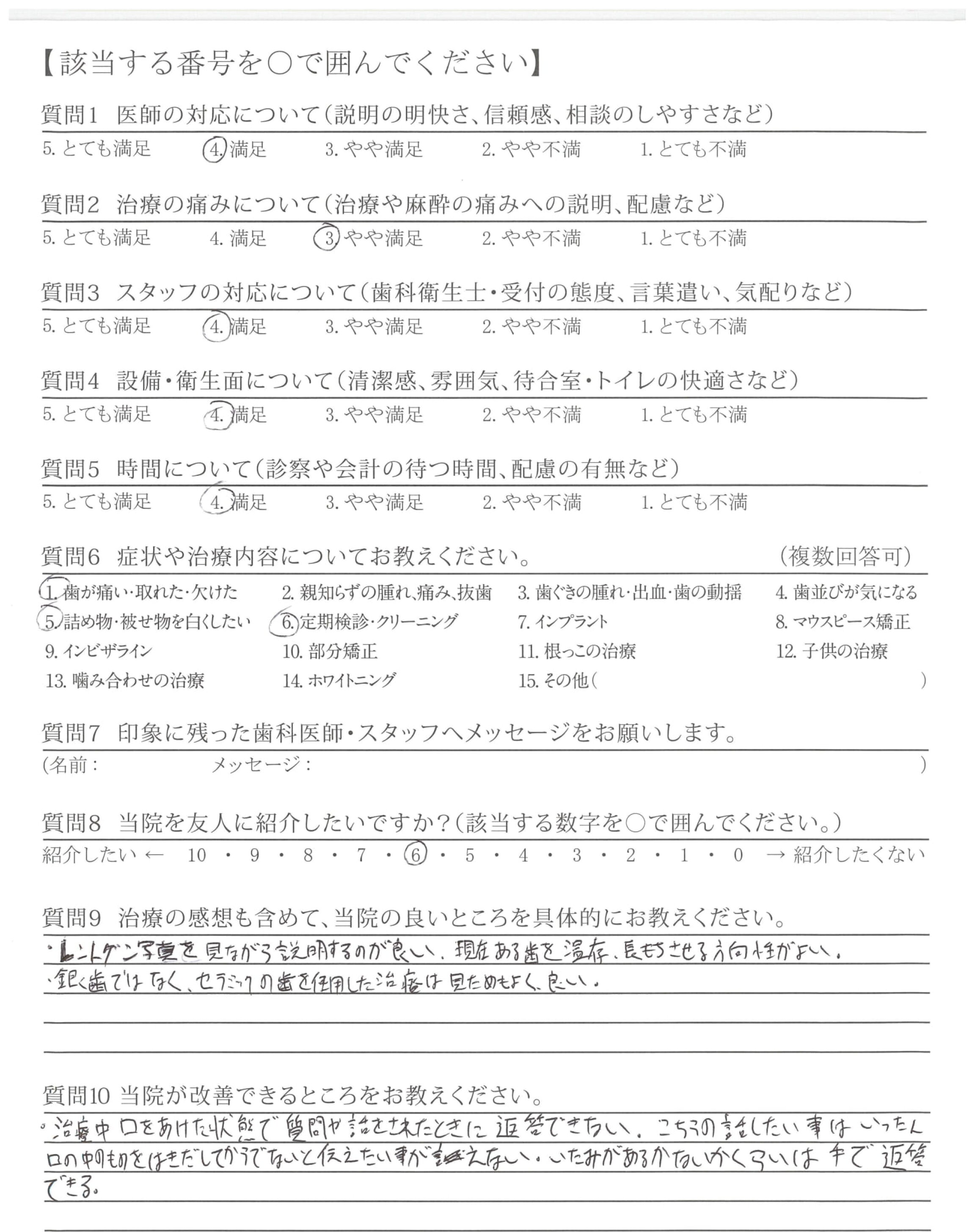 ③説明がていねい・・・毎回先生・技師の方々からどのような治療するかとか、迷っていると提案もあり、納得して治療ができた。今までこのへんで嫌になり治療完了してませんでしたが、今回はがんばれそうです。