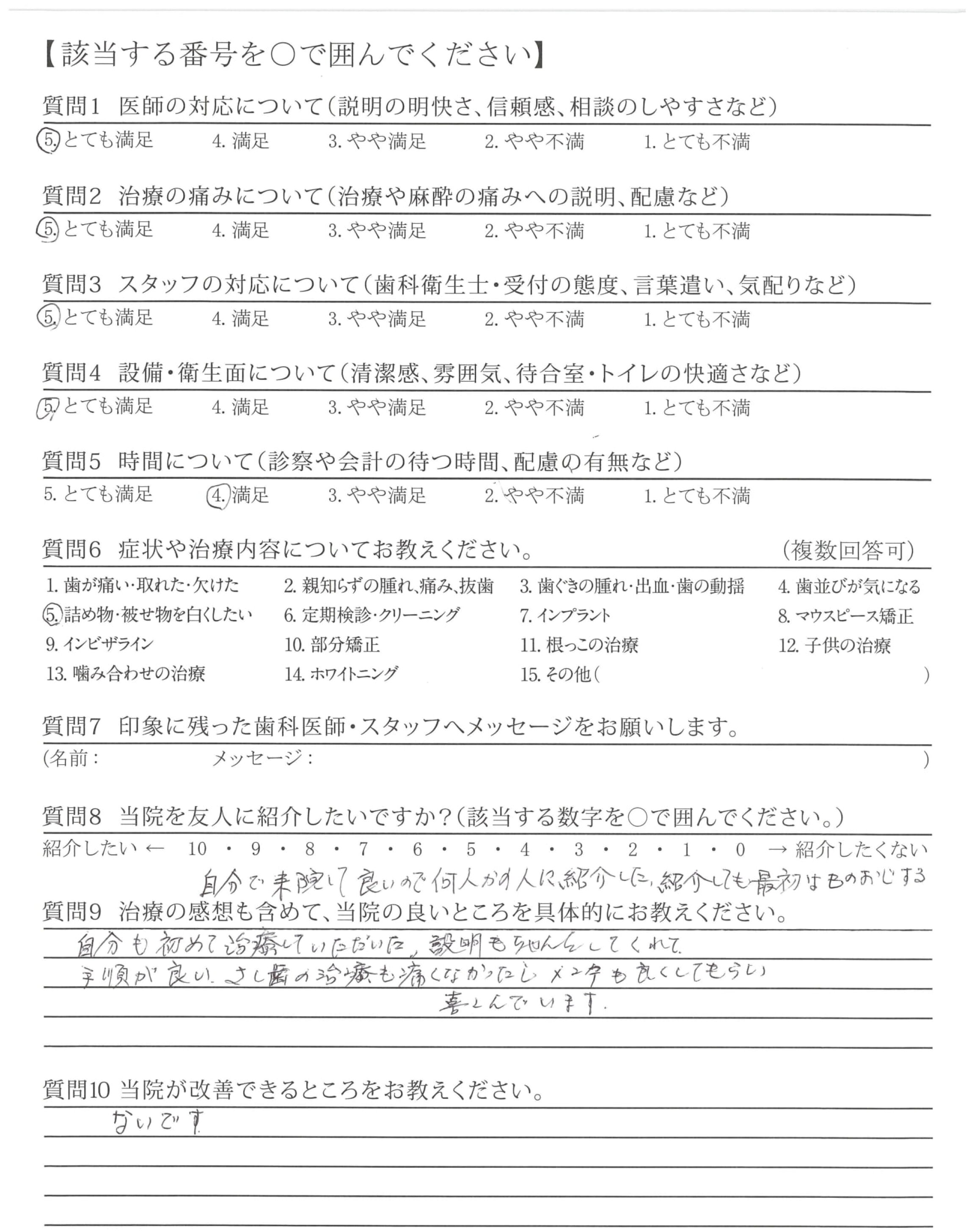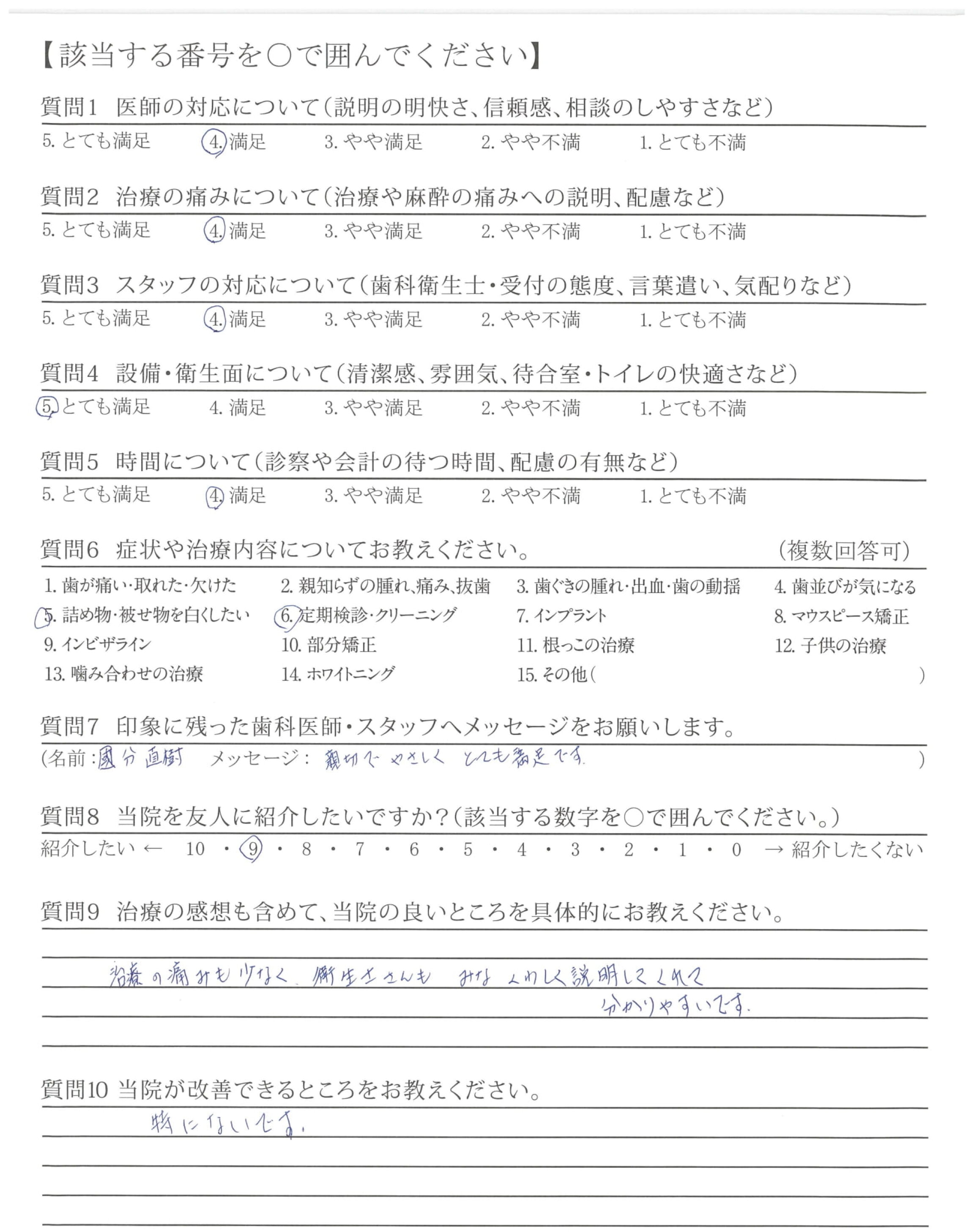 さし歯の治療も痛くなかったし、メンテも良くしてもらい喜こんでいます。
