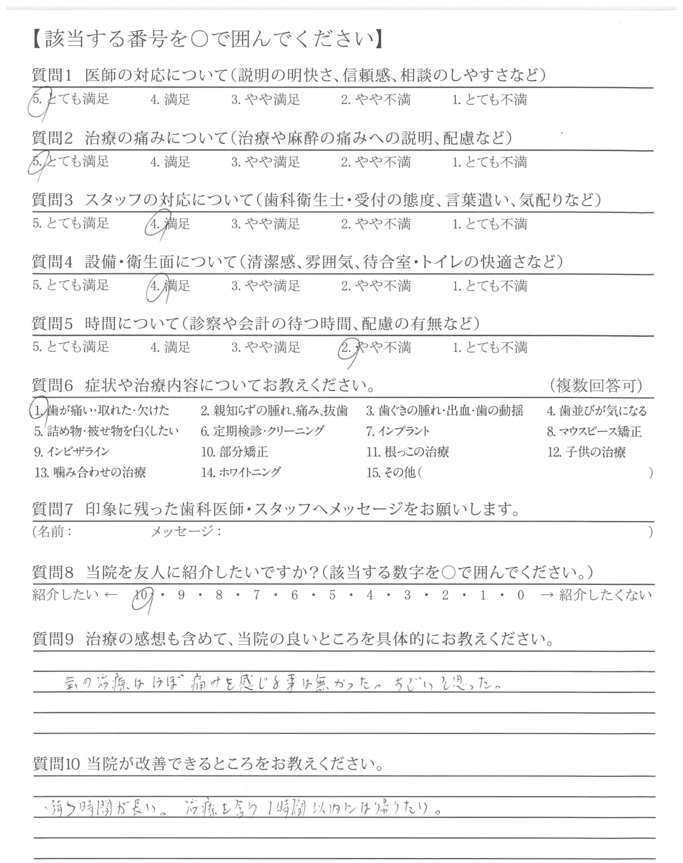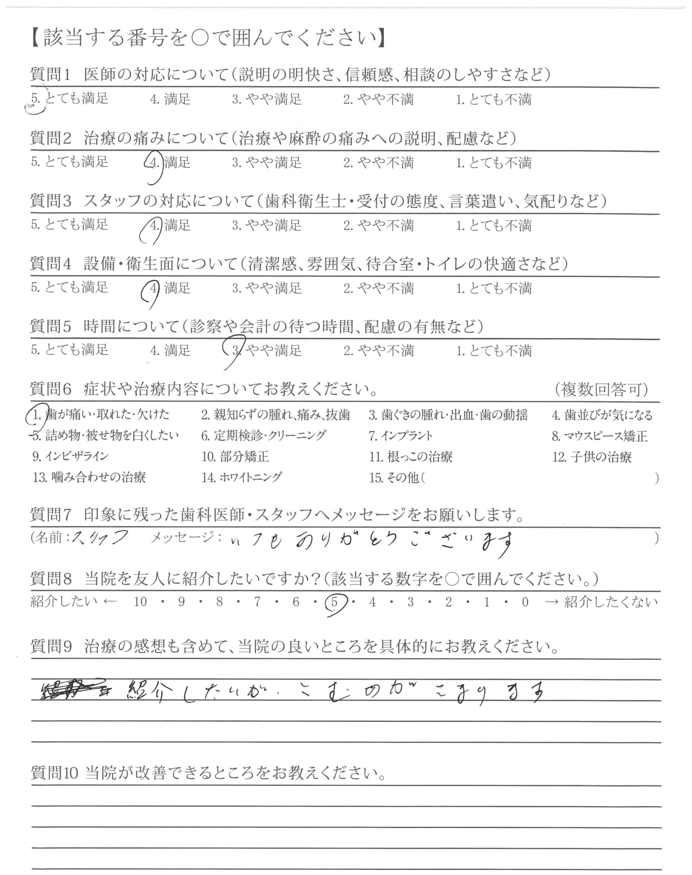 実に40年ぶりの歯の治療でした。とにかく歯の治療が嫌いでしたが、スタップの皆様すべてが親切、丁寧でした。おかげさまで、なかなか予約がとれない状況で治療に1年かかりましたが、ぶじに完治できた。