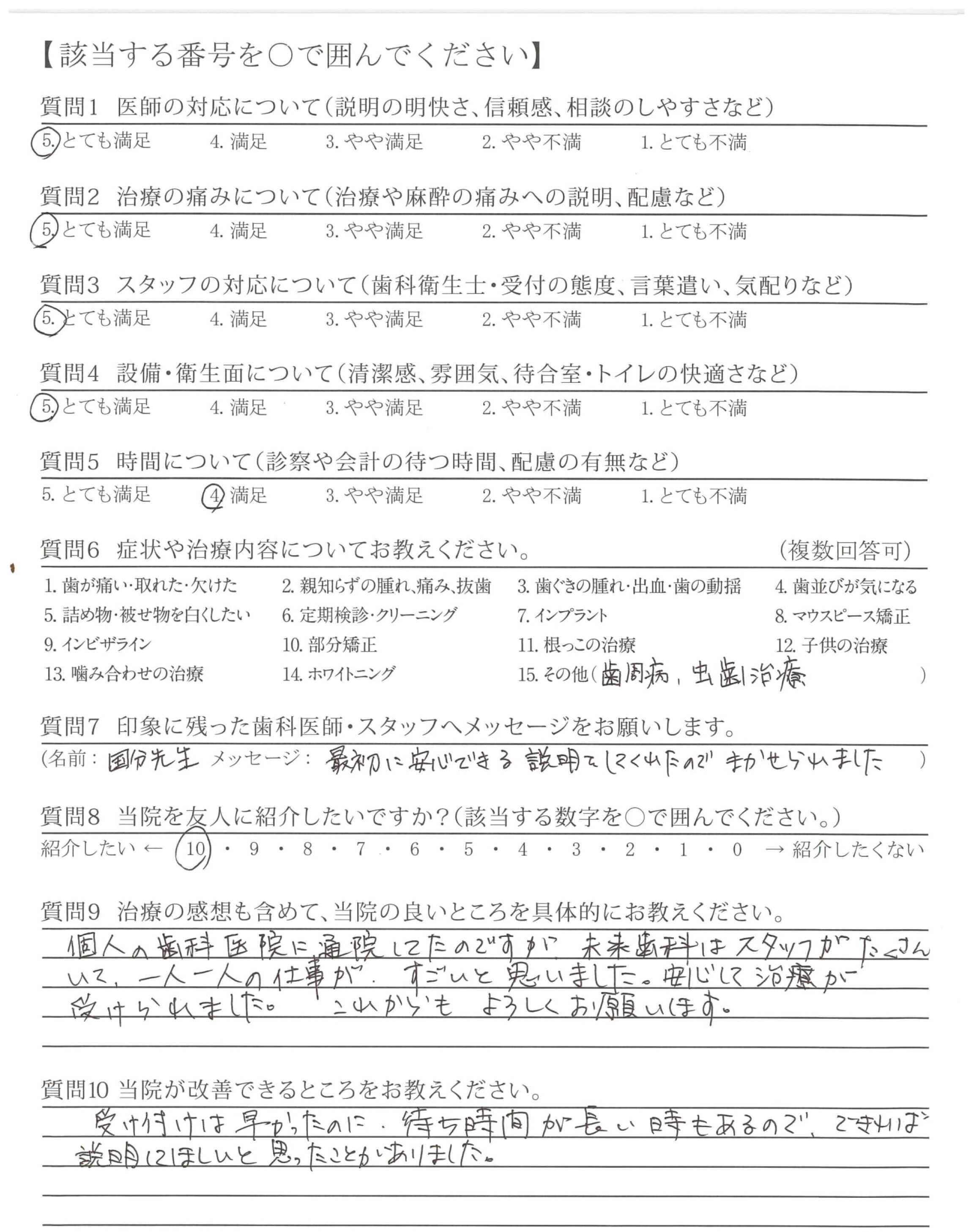 個人の歯科医院に通院してたのですが未来歯科はスタッフがたくさんいて、一人一人の仕事が、すごいと思いました。安心して治療が受けられました。これからもよろしくお願いします。