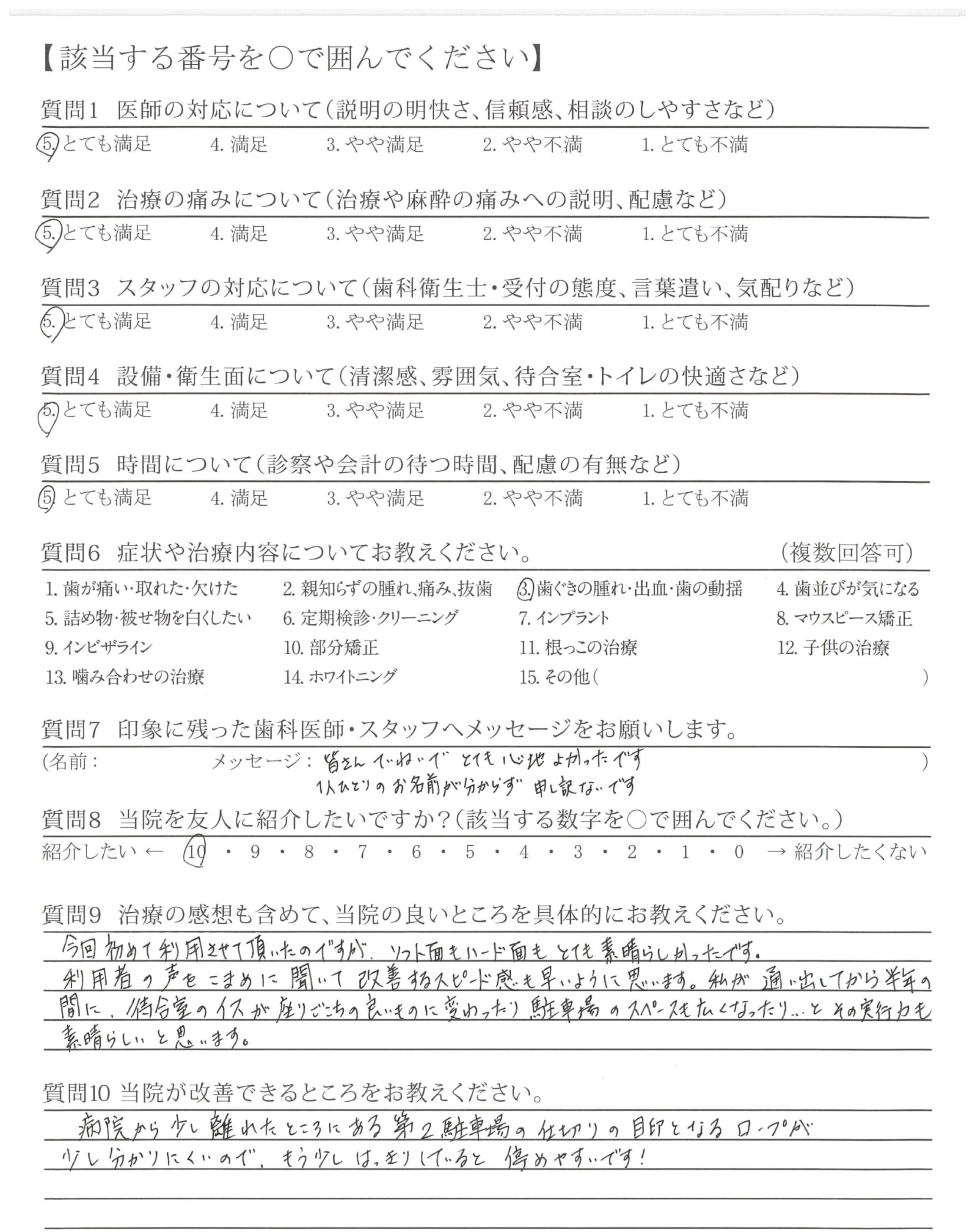 いつも丁寧に治療して頂きありがとうございます。もっと早く受診していれば良かったです。