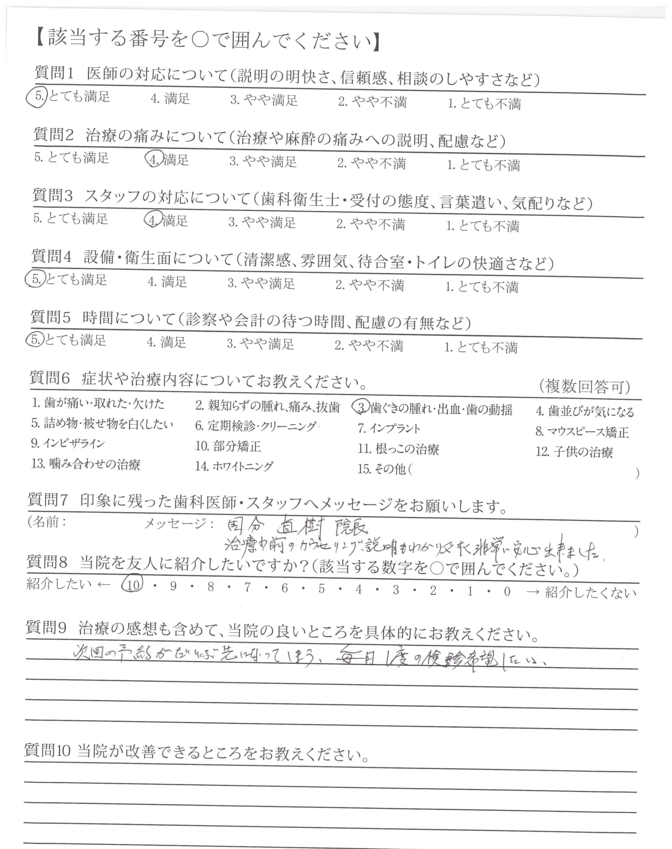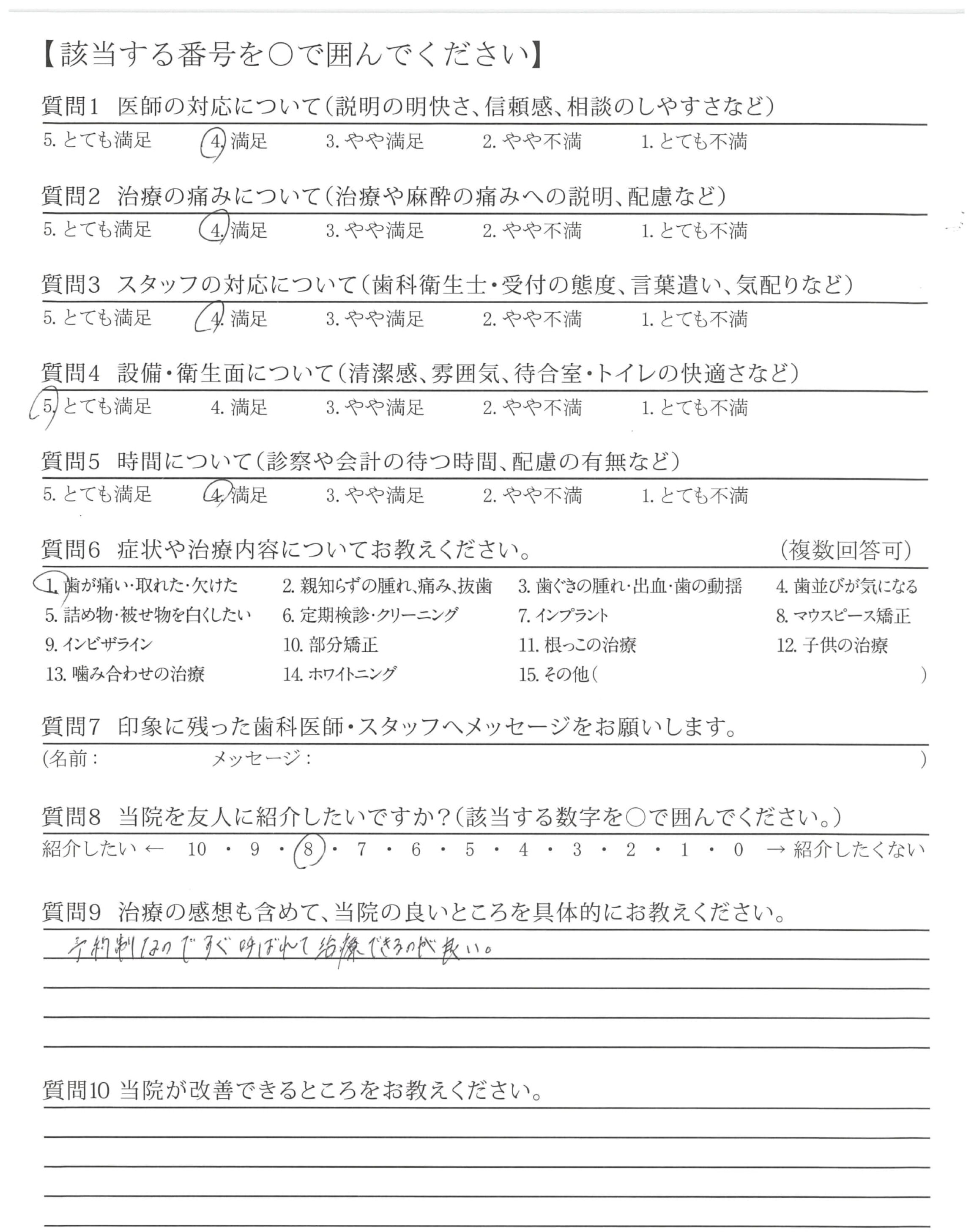 ・良い治療方法を提案してくれ、治療を進めているところですが、口内の状態が良くなって来ている事に感謝しています。