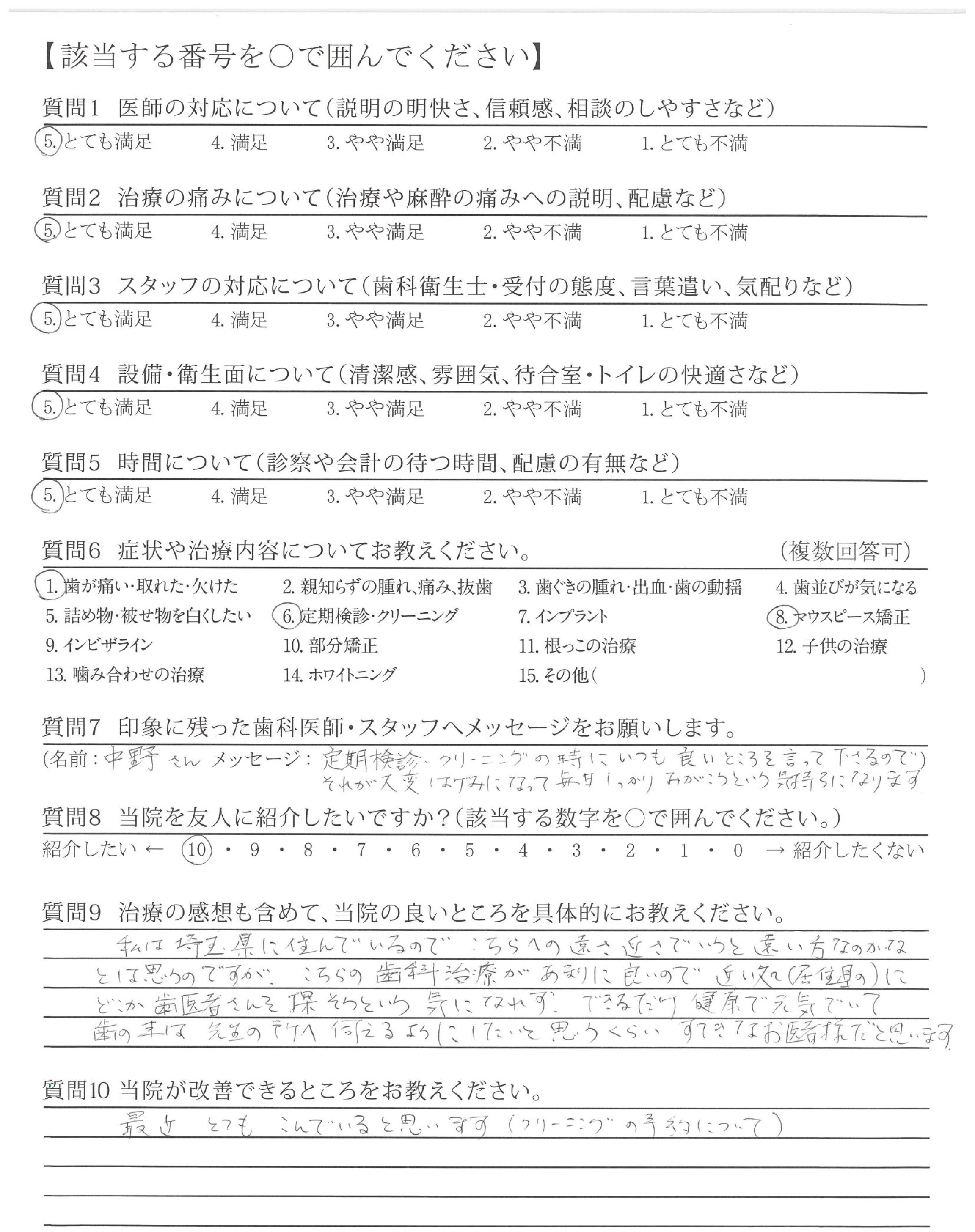 特に思いあたりませんが、月に1.2度でも遅い時間帯に治療や検診を受けられるとありがたいと思いました。