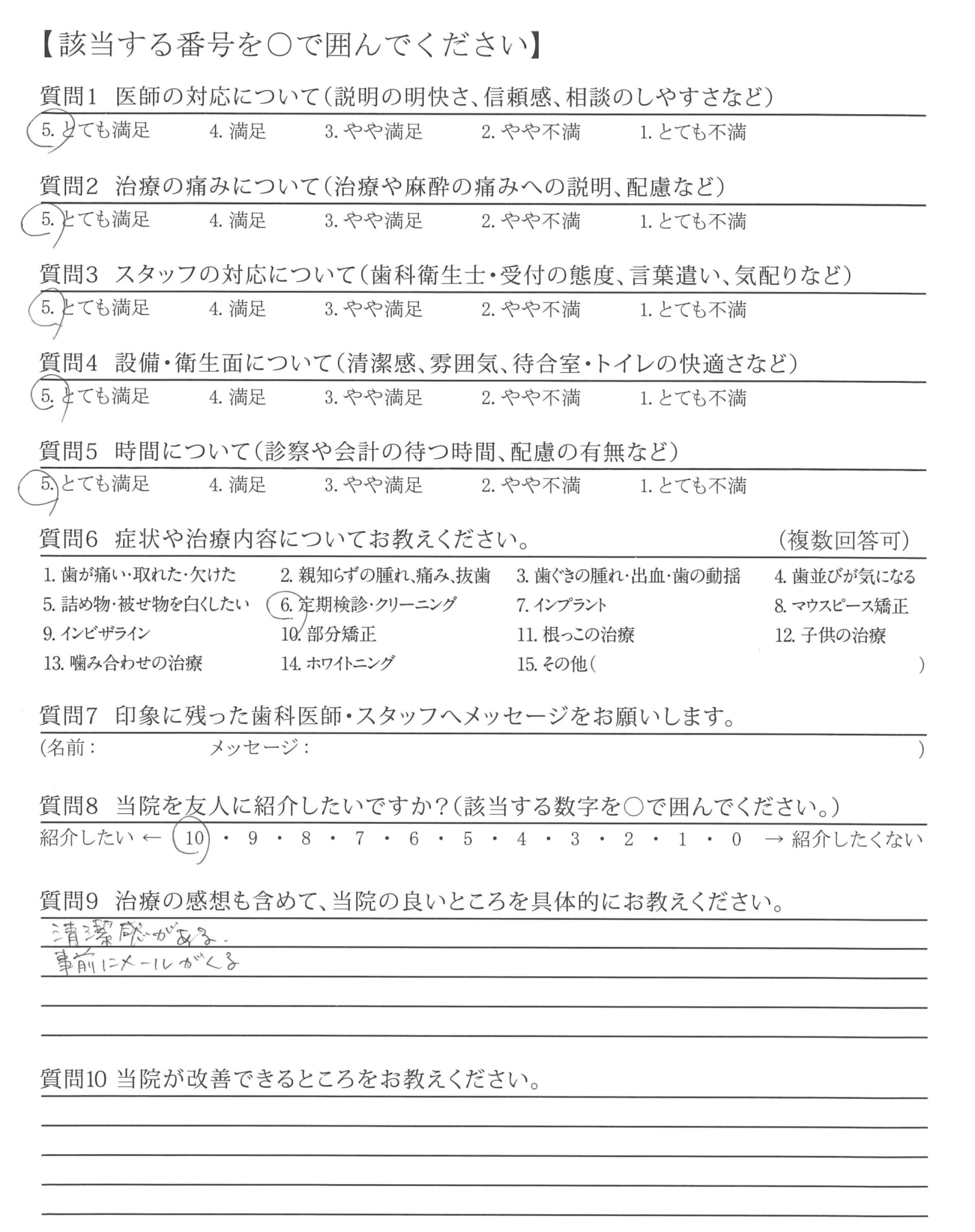当サイトに掲載しているアンケートは、第三者機関である日本歯科医療評価機構が医院の協力を得て直接患者さんへ調査を行ったもので、医院では操作のできない客観的な評価です。毎週患者さんから届くアンケート結果を集計し、このページを更新しています。