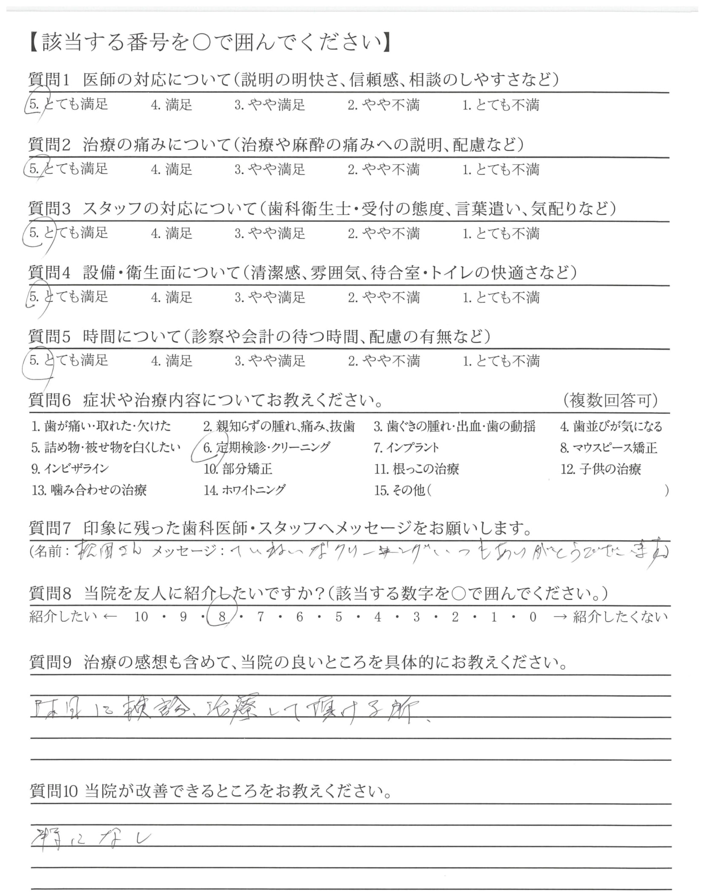丁寧な治療をしてもらえていると思うが、若干荒いときがあり痛みを感じる時がある。