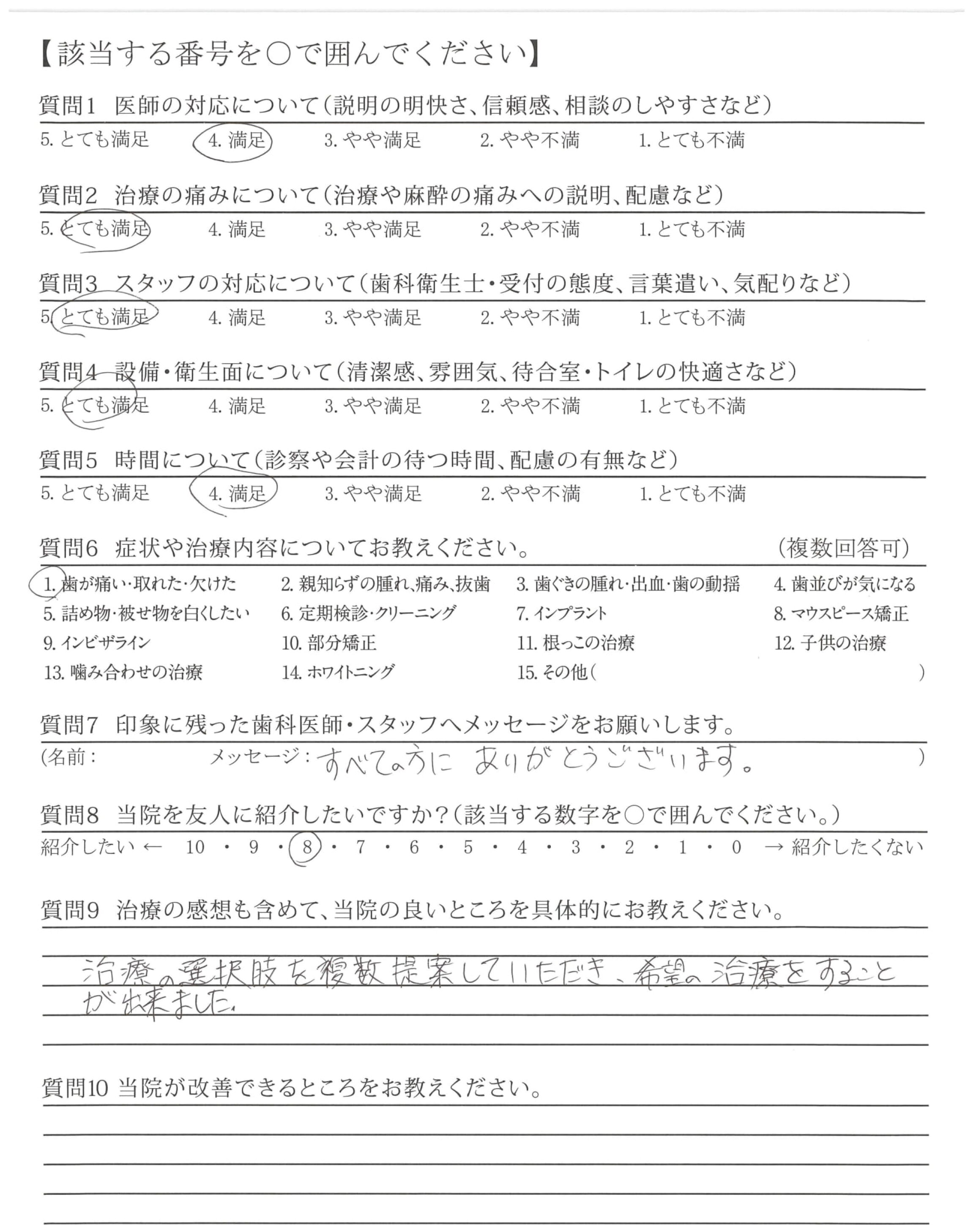 治療の選択肢を複数提案していただき、希望の治療をすることが出来ました。
