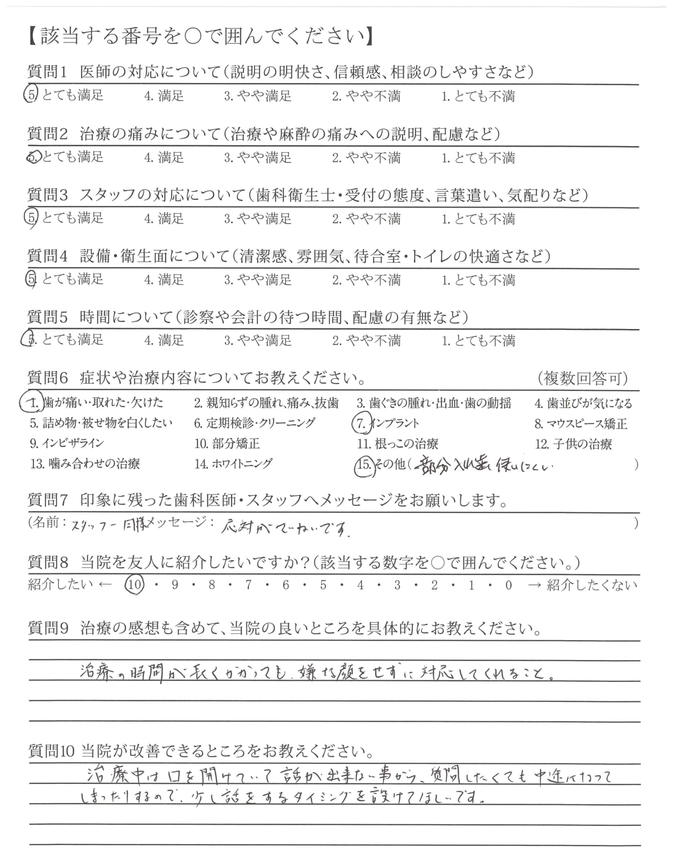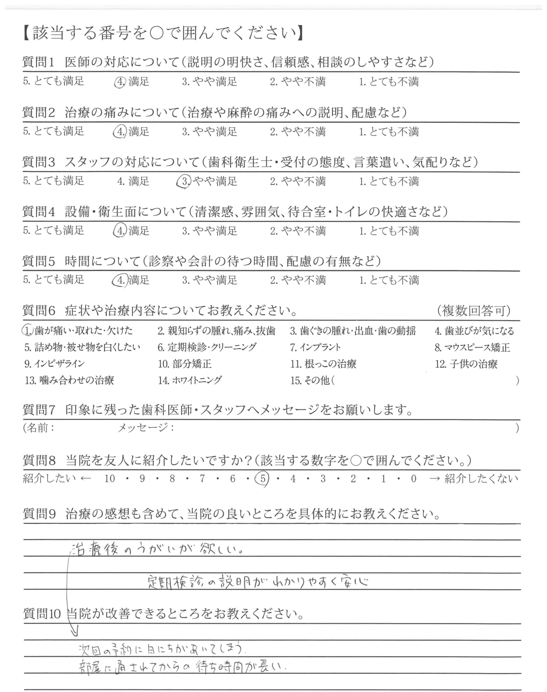 治療中は口を開けていて話が出来ない事から、質問したくても中途になってしまったりするので、少し話をするタイミングを設けてほしいです。