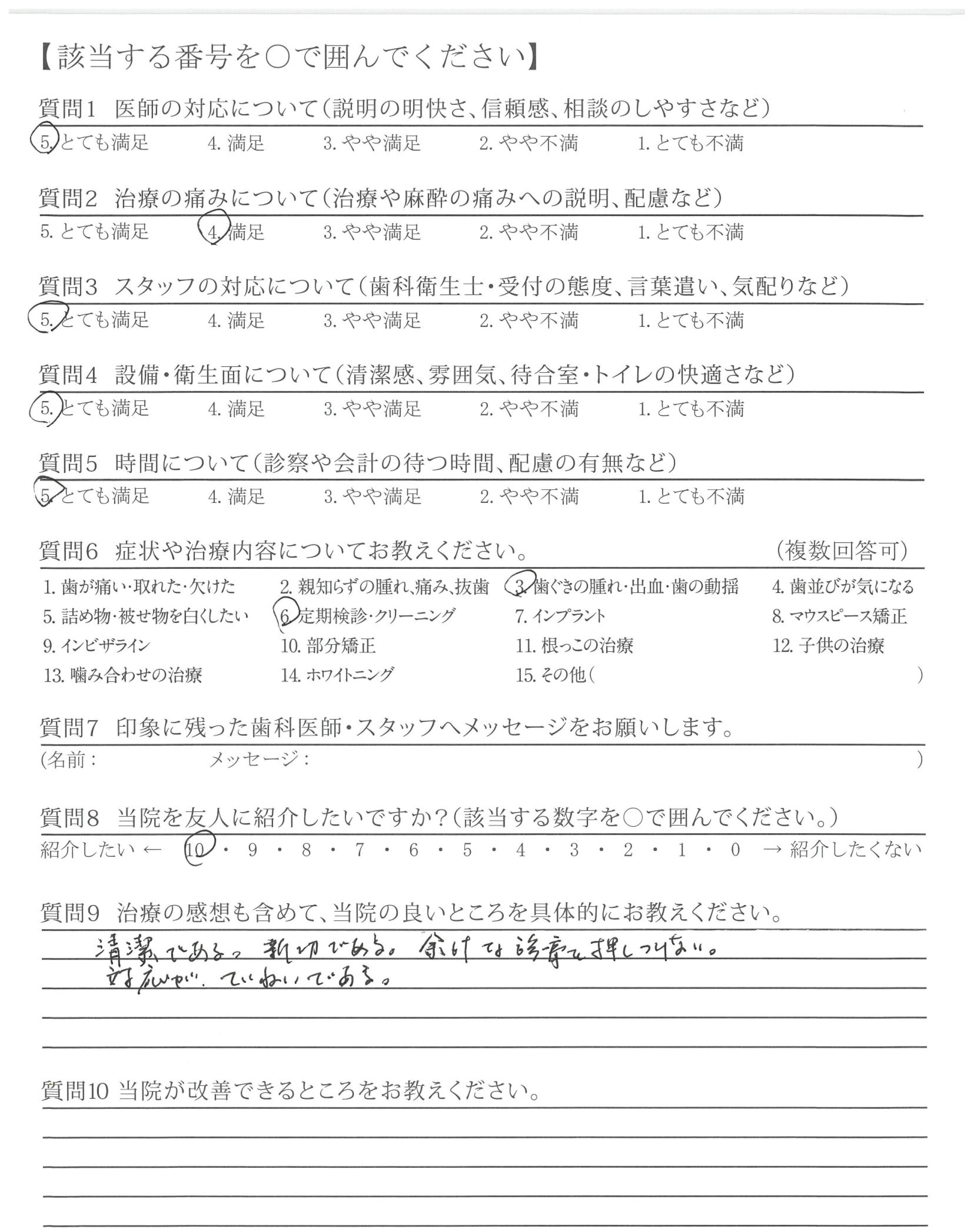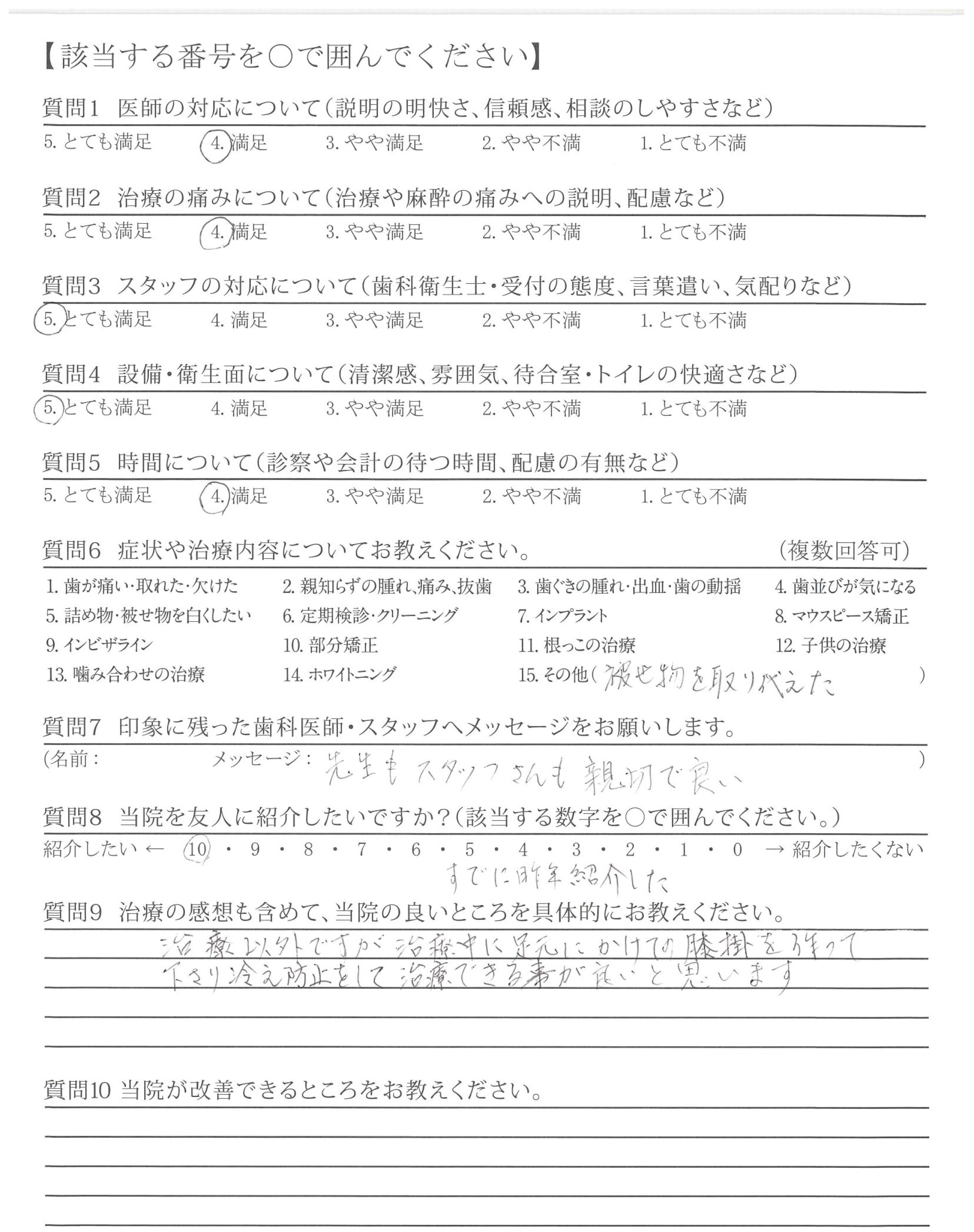 今回前側の両サイドの根元の方が欠落してしまい、又きれいにして頂きました。他の歯科の医院の先生にはこの技術が無いらしく入れ歯にする様に強く薦められました。自分の歯で、見た目も良くなり満足しています。