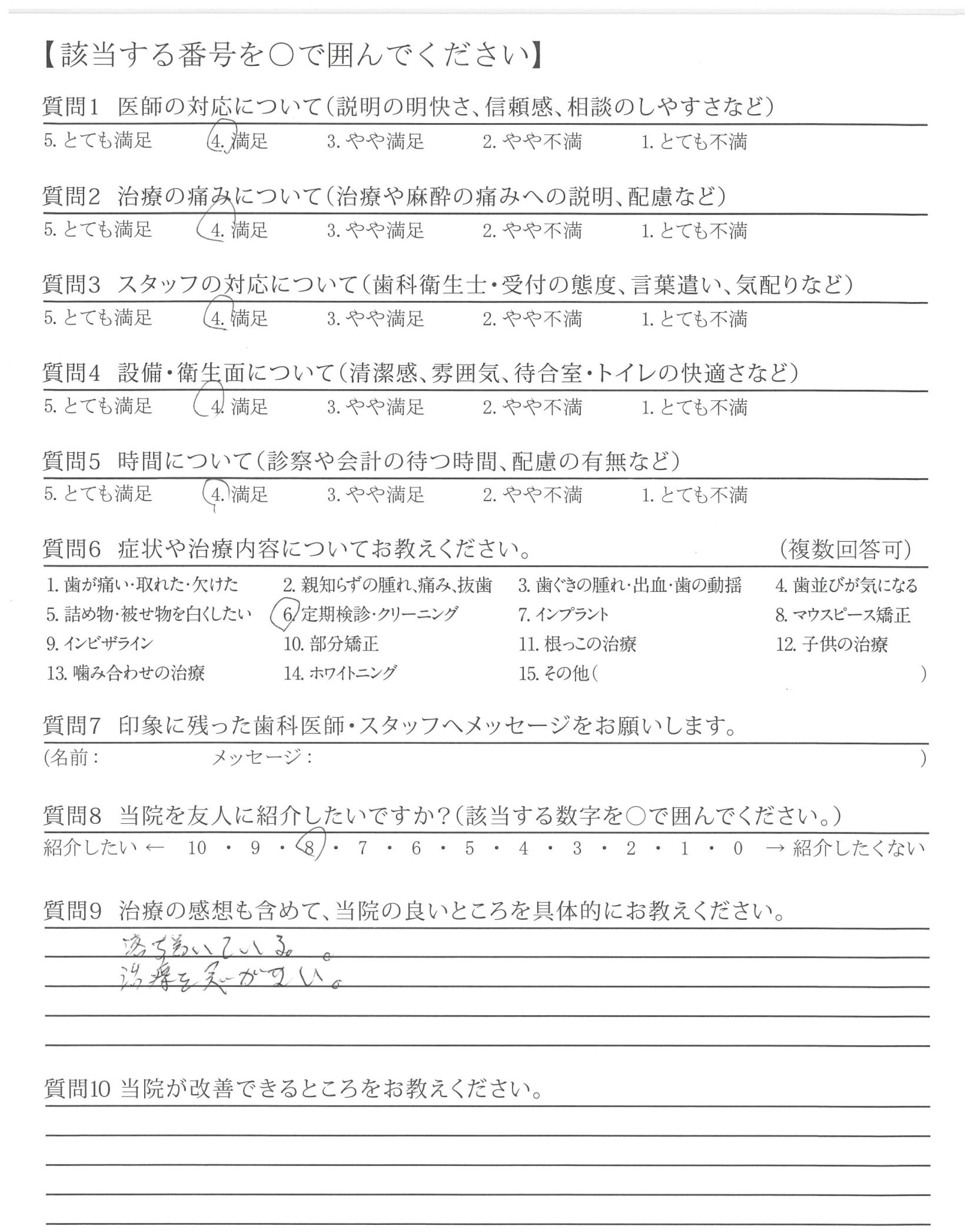 クリーニングしていただいた際、歯みがきのアドバイスがわかりやすく、患者にあわせた対応を考えてくれるのが嬉しい。