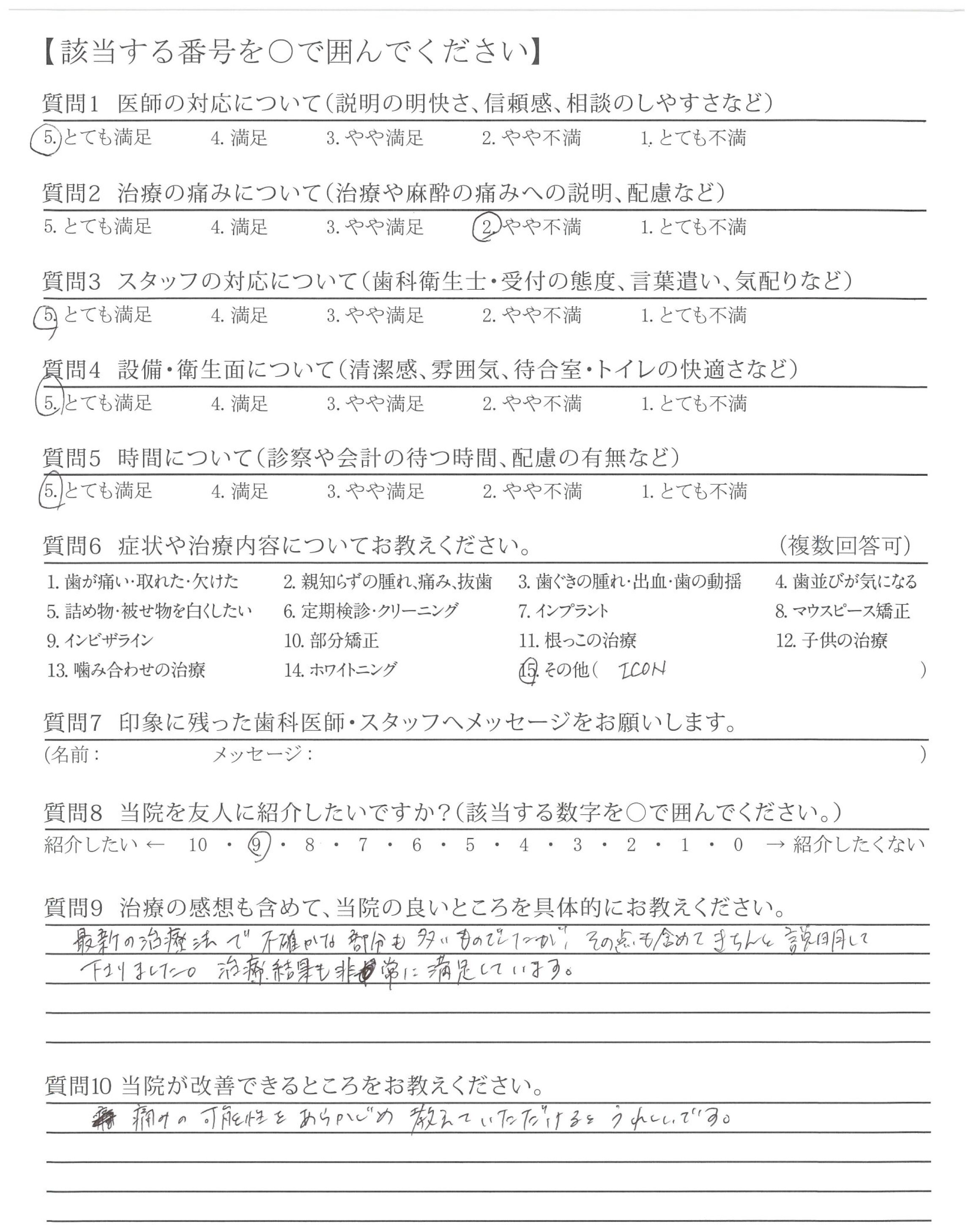 痛酔が必要かどうかを前回の治療の際に説明した上で、麻酔が完全に効いた時点で治療を始めるのには、とても好感しました。また、精神障がいがある私にとてもやさしく対応してくださったドクター・スタッフのみなさまにとても感謝しております。