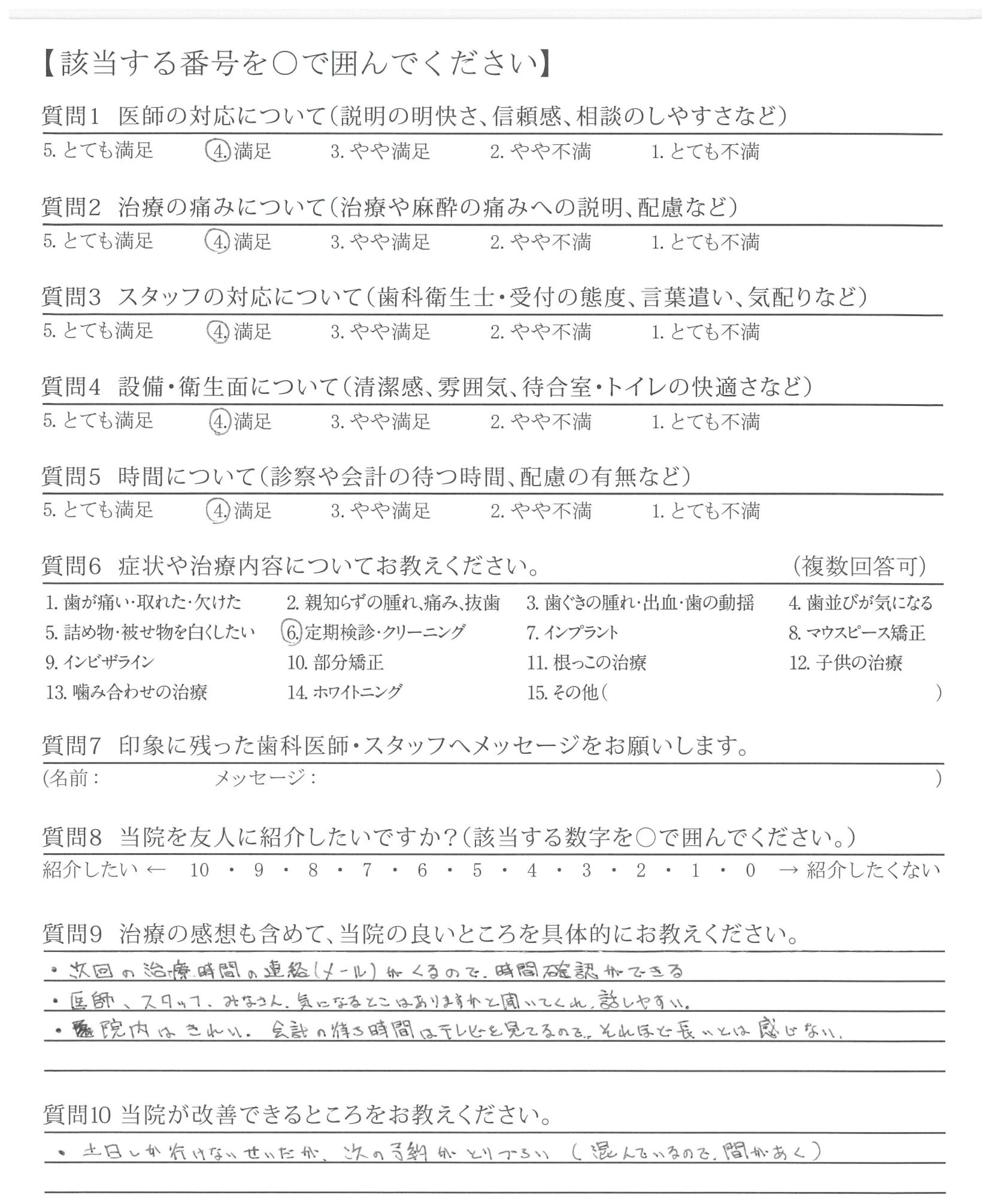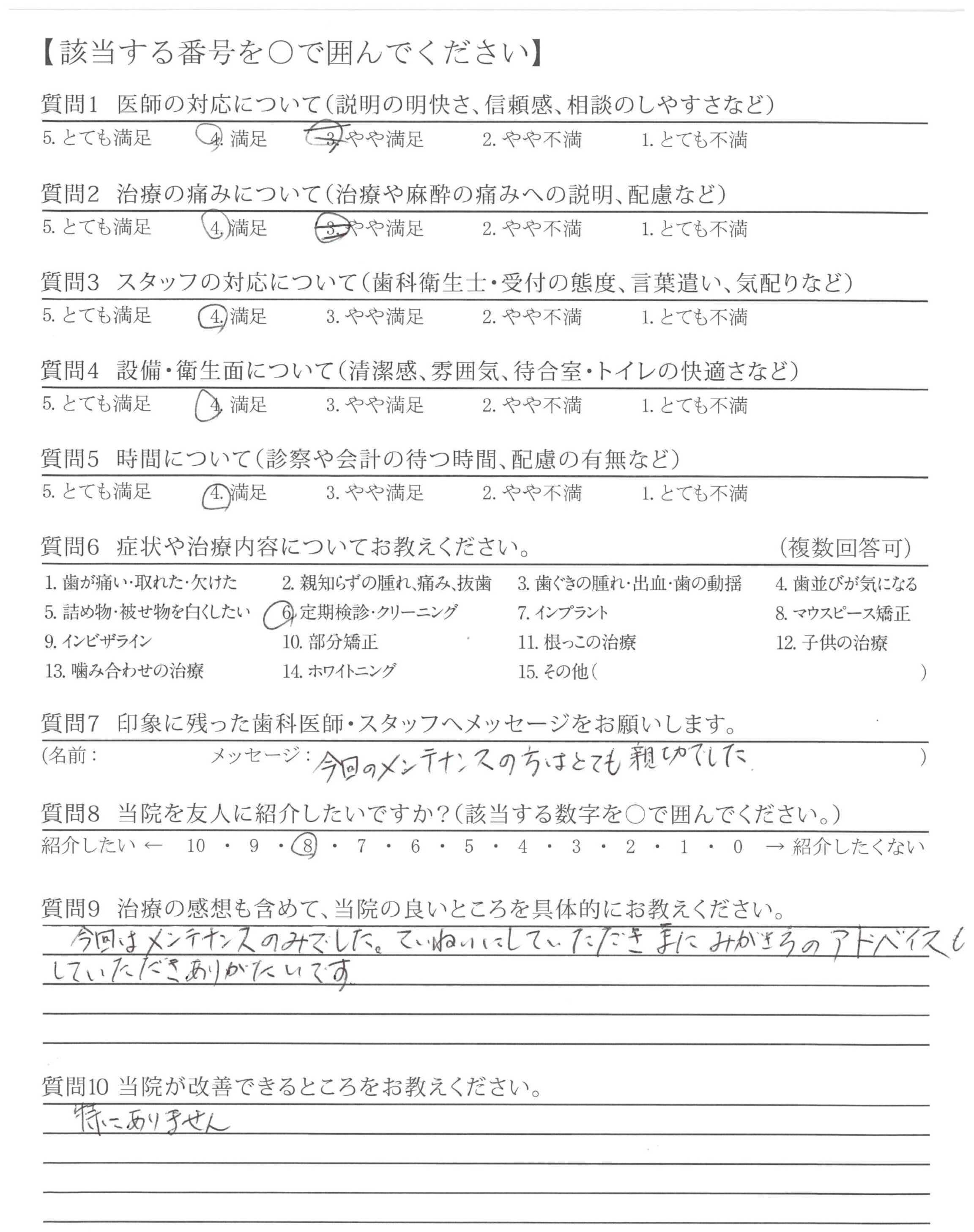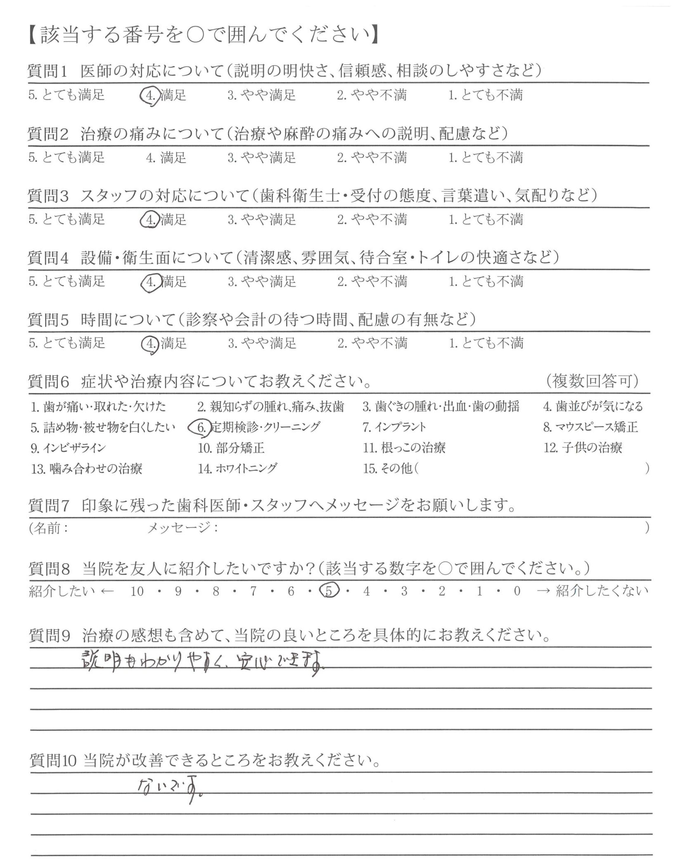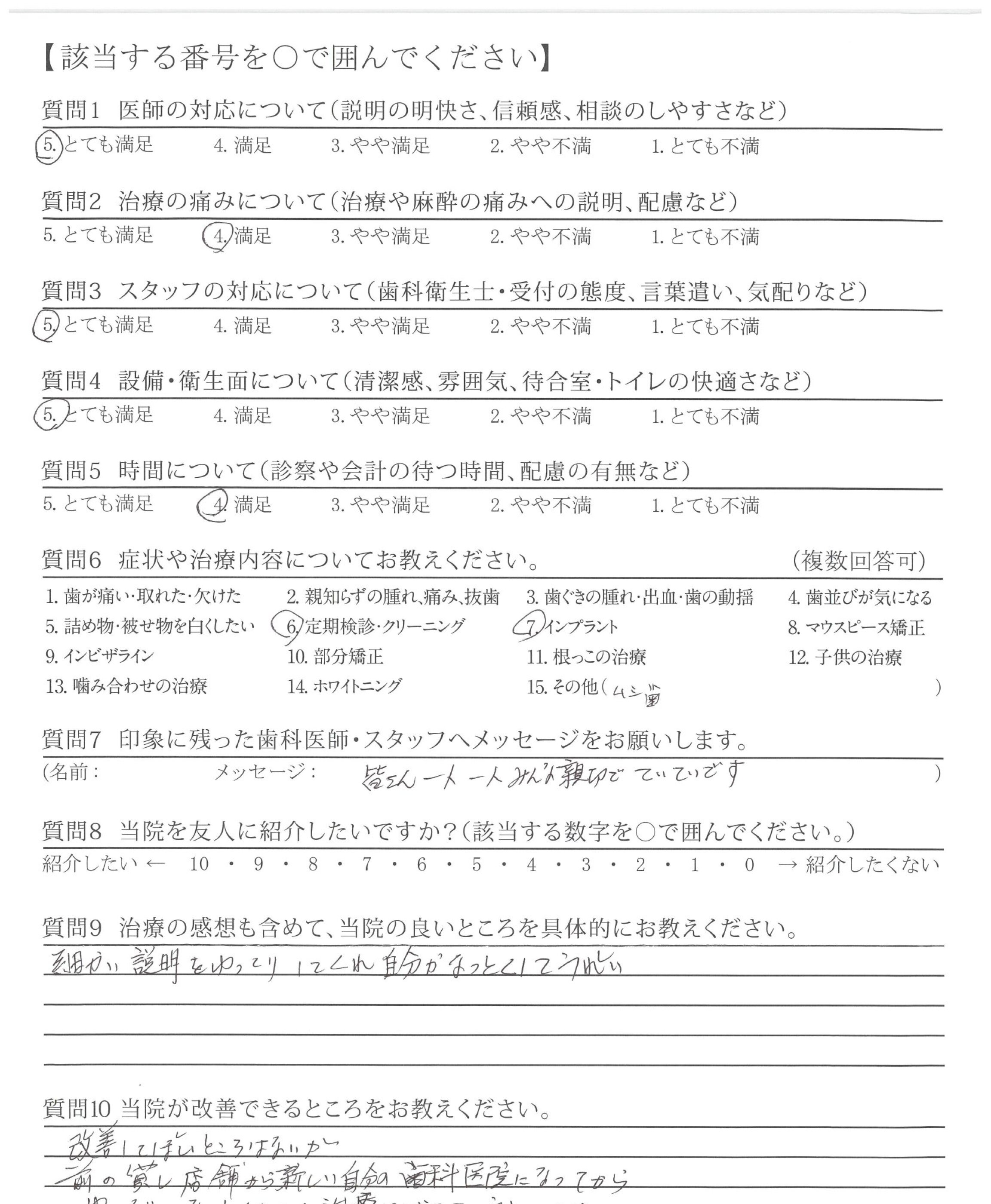 改善してほしいところはないが、前の貸し店舗から新しい自分の歯科医院になってからゆっくり、なっとくのいく治療ができて、うれしいです