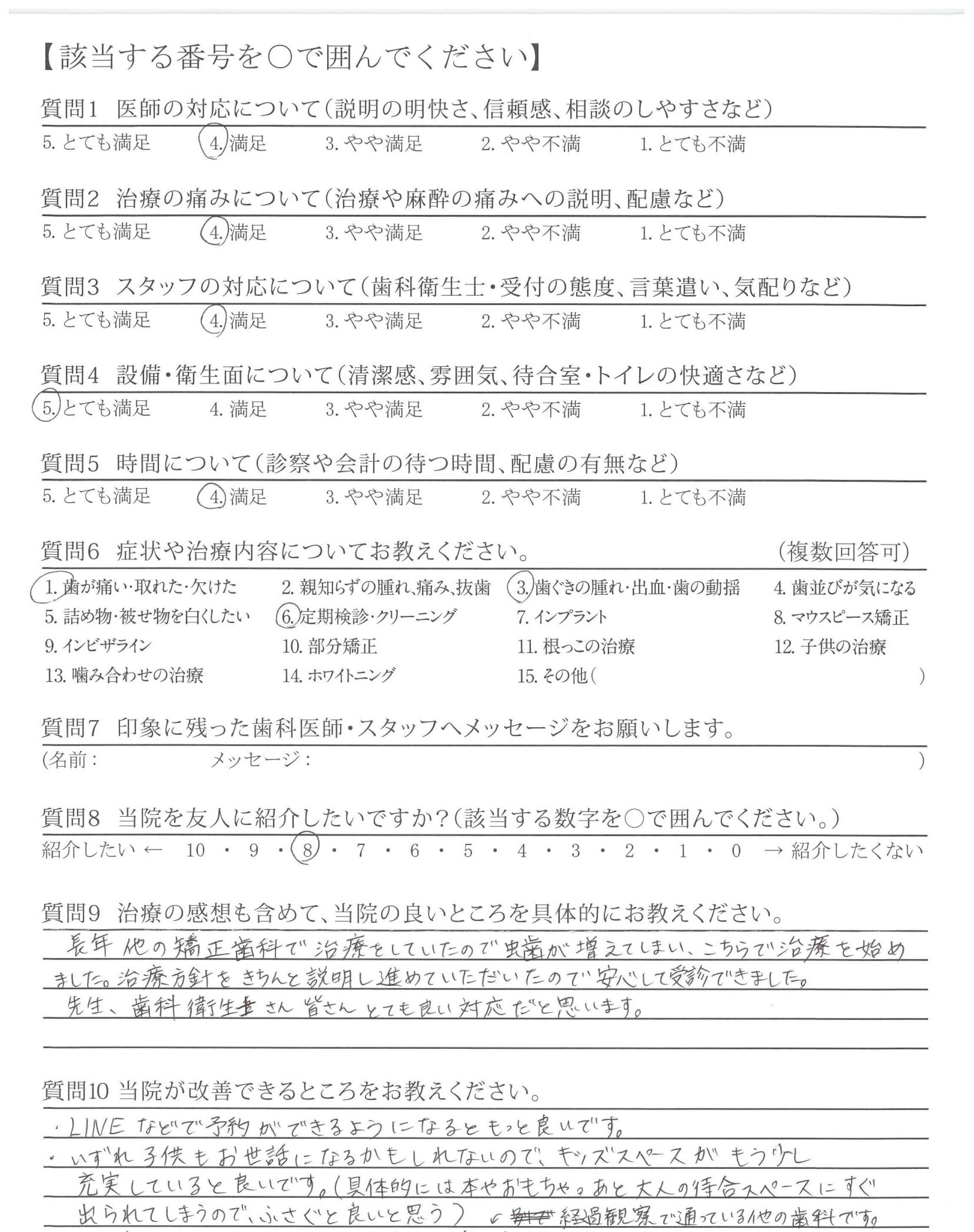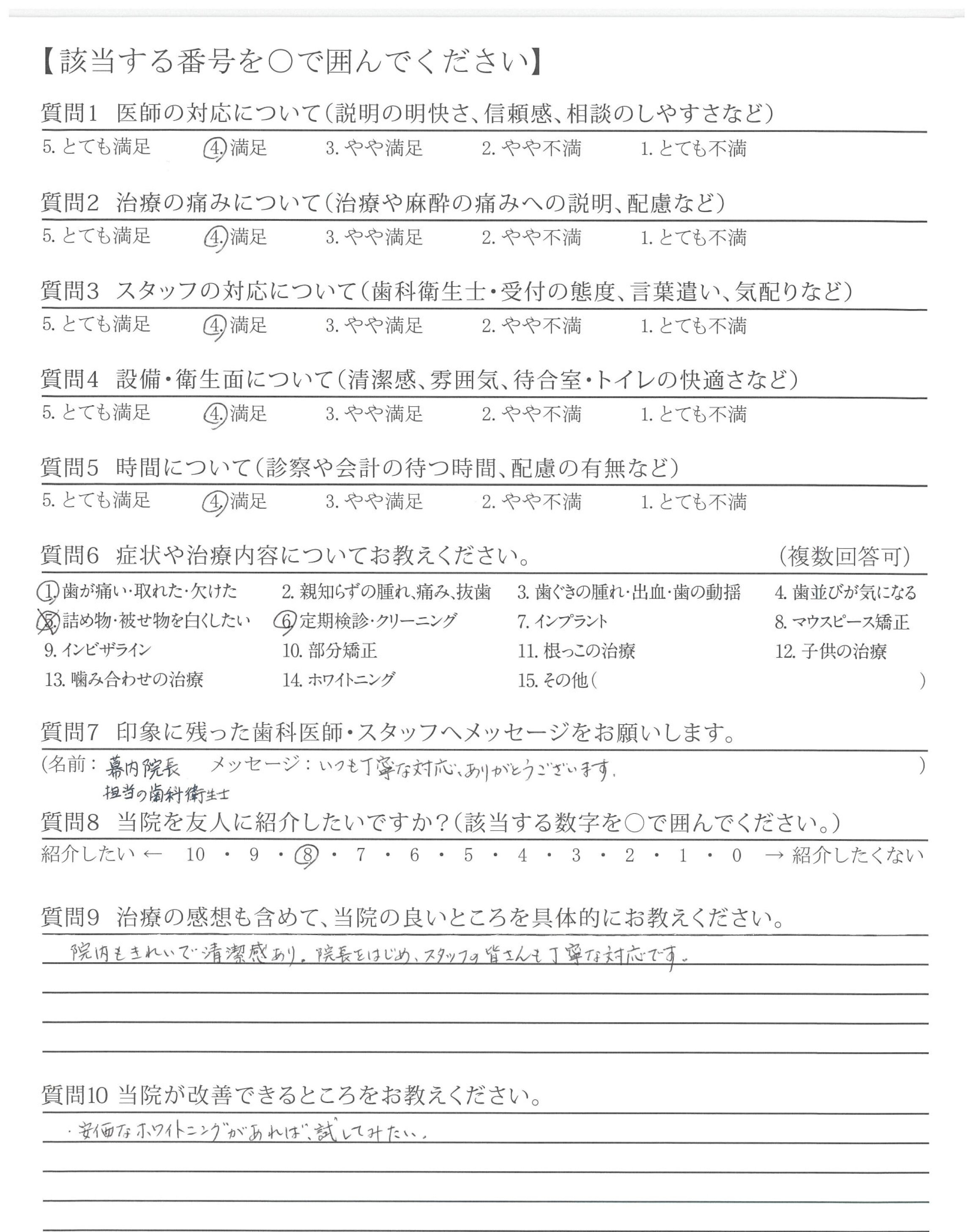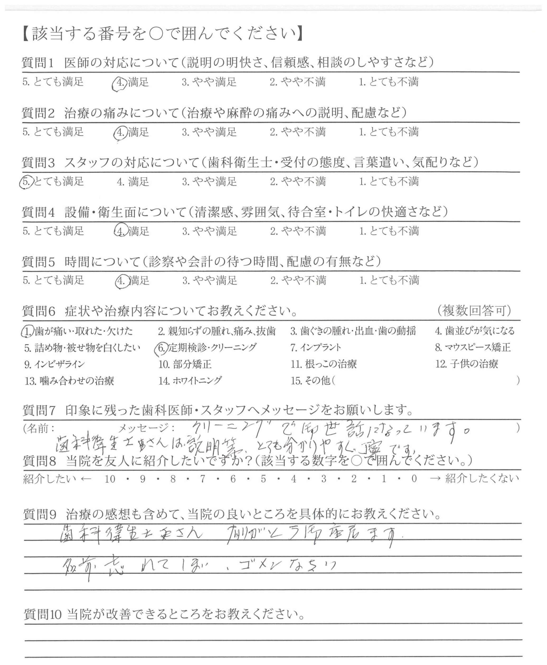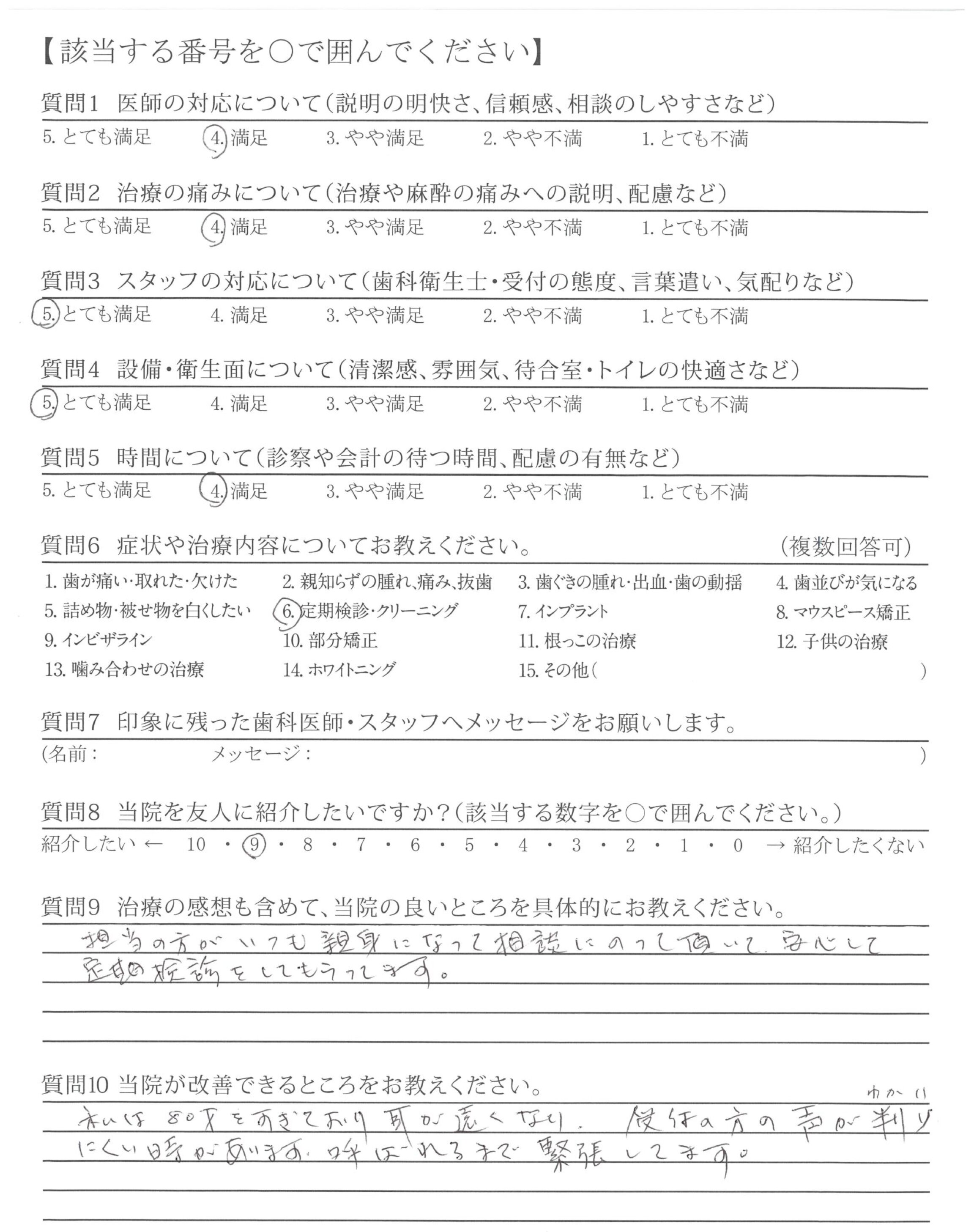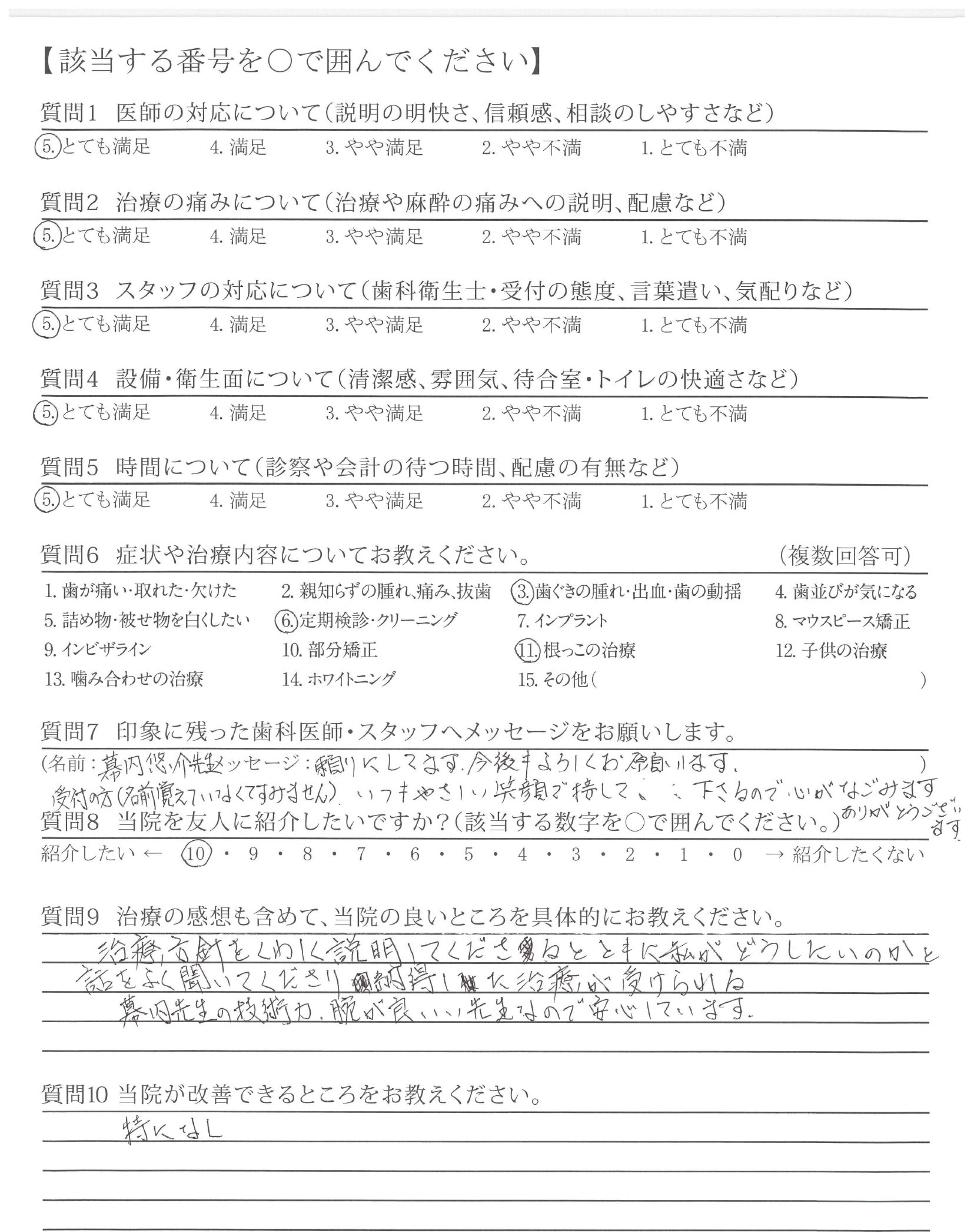 改善してほしいところはないが、前の貸し店舗から新しい自分の歯科医院になってからゆっくり、なっとくのいく治療ができて、うれしいです