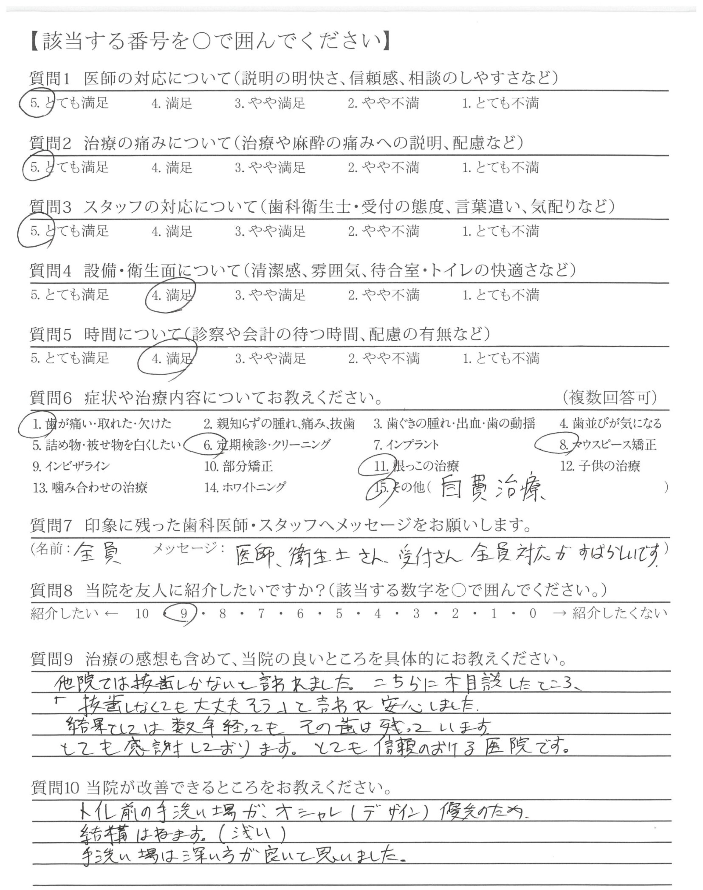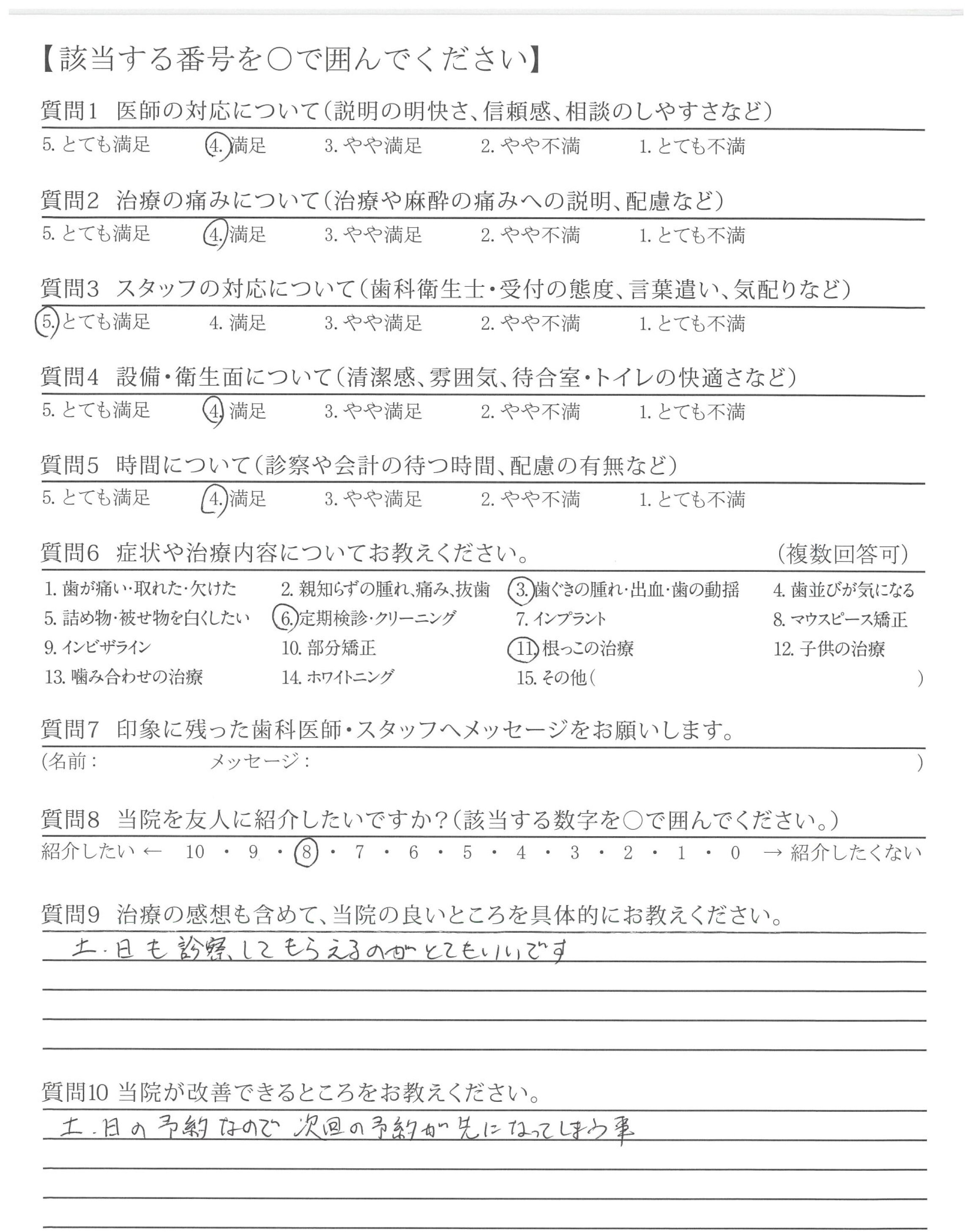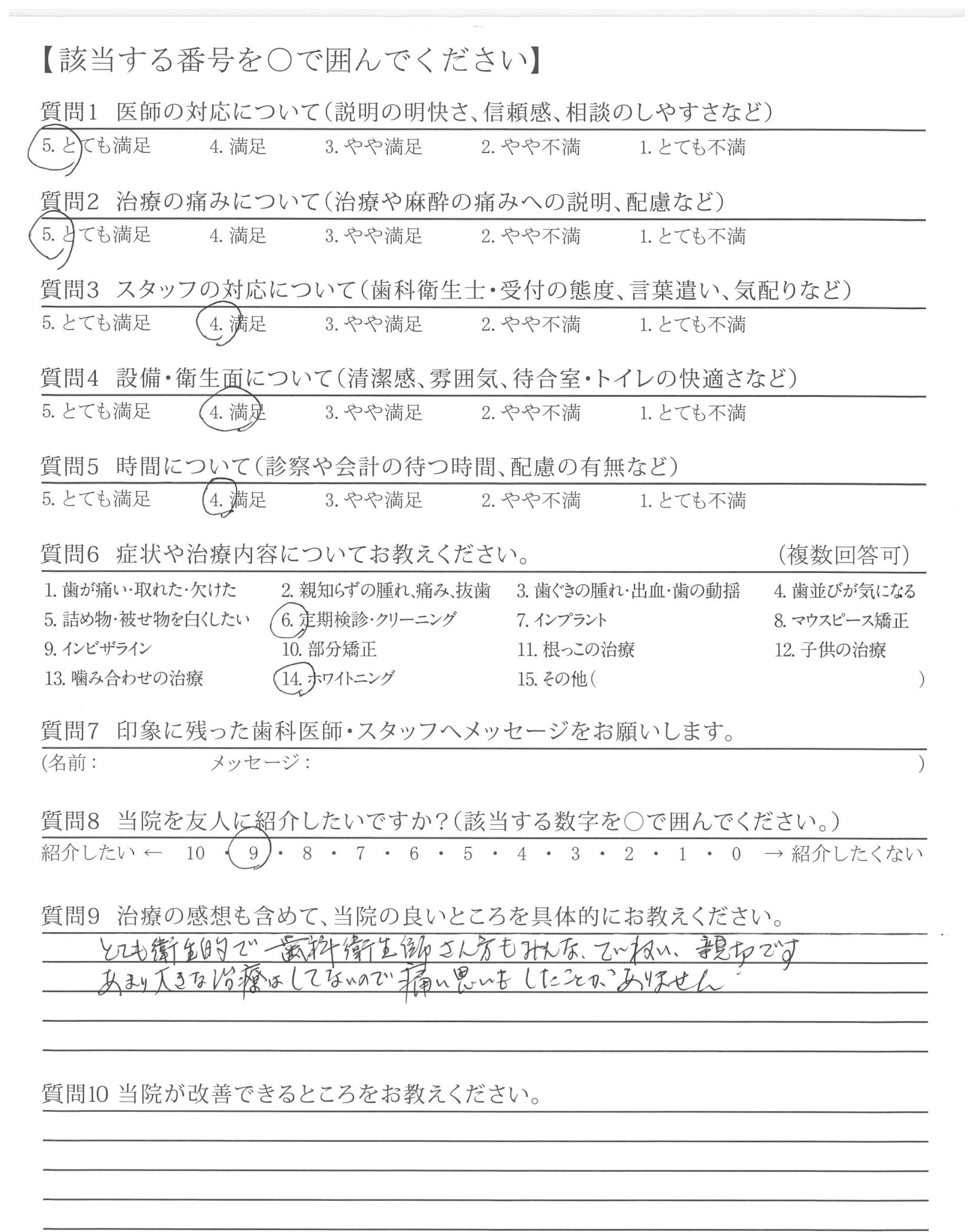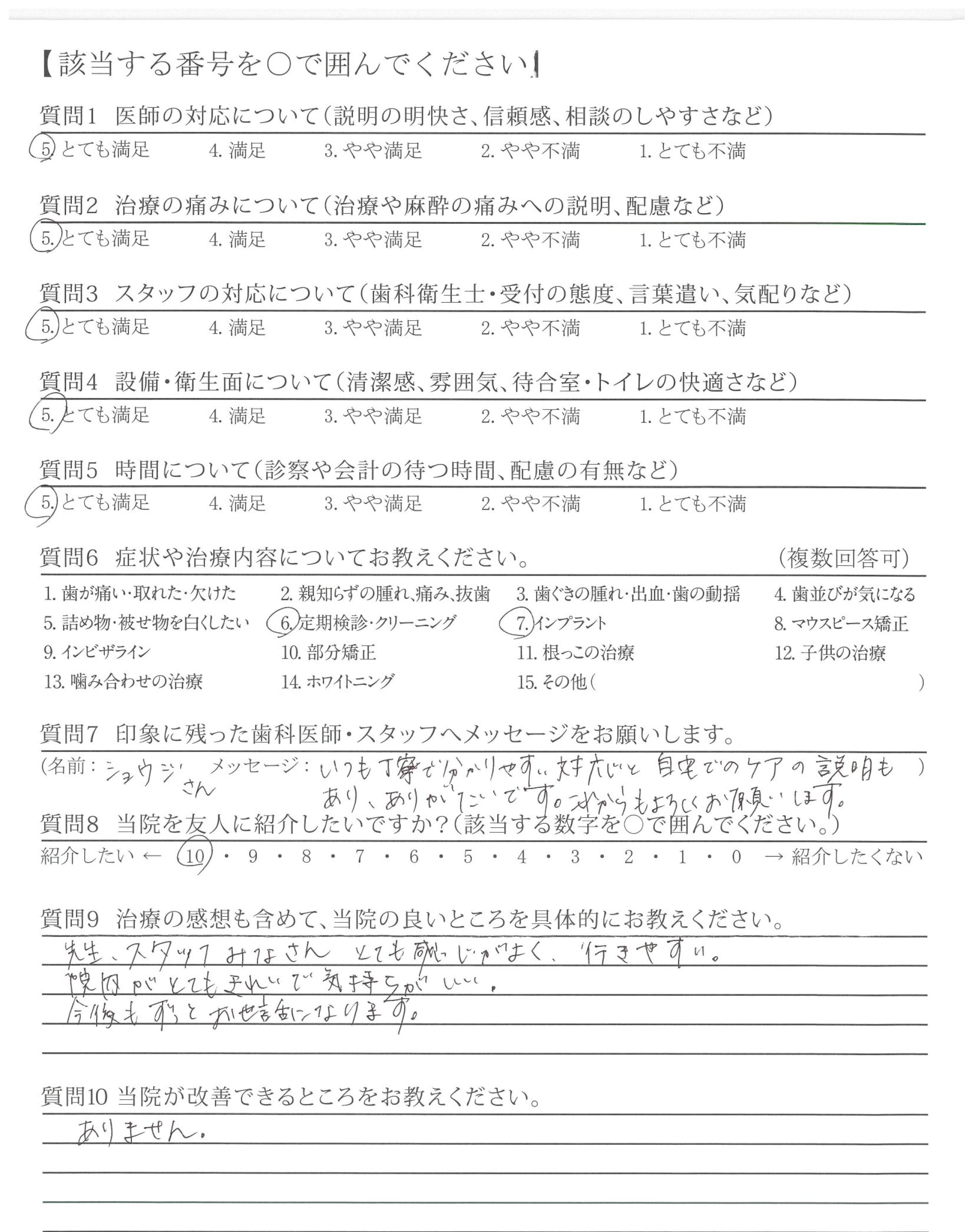 改善してほしいところはないが、前の貸し店舗から新しい自分の歯科医院になってからゆっくり、なっとくのいく治療ができて、うれしいです