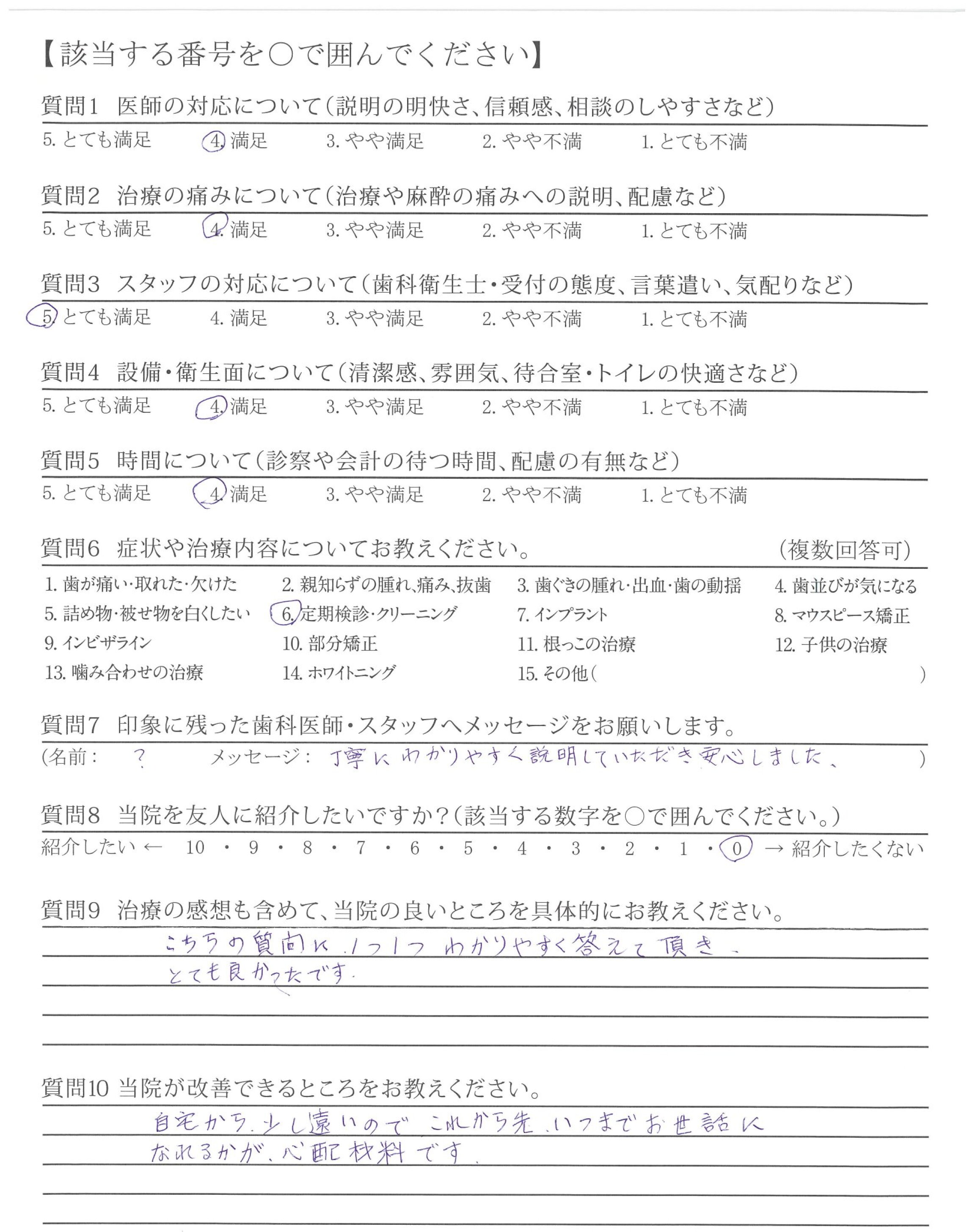 いつも丁寧で分かりやすい対応と自宅でのケアの説明もあり、ありがたいです。これからもよろしくお願いします。
