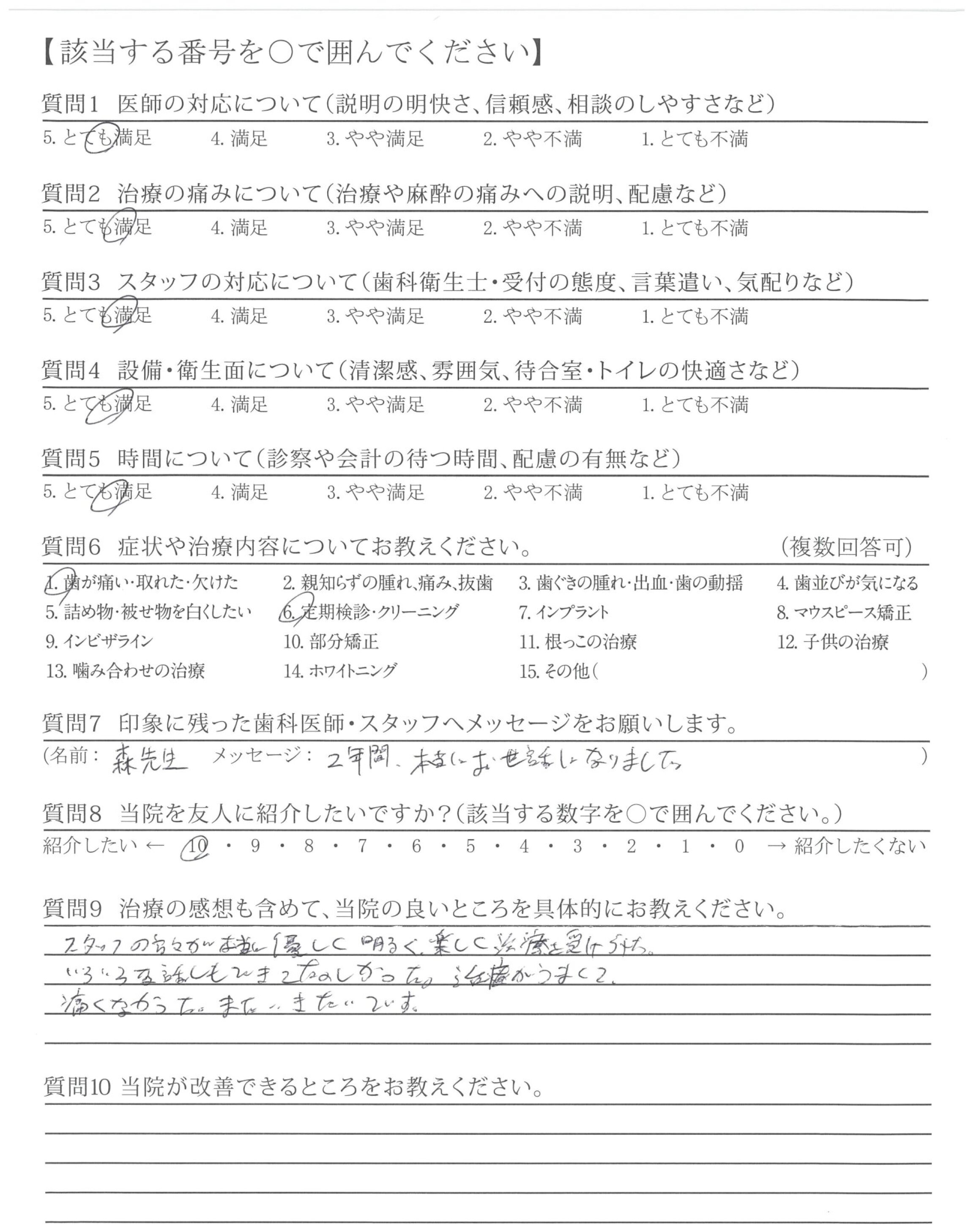 アフターケアもしっかりやってくれ、スタッフの方々の対応、説明もわかりやすく、いつも安心して通っている。