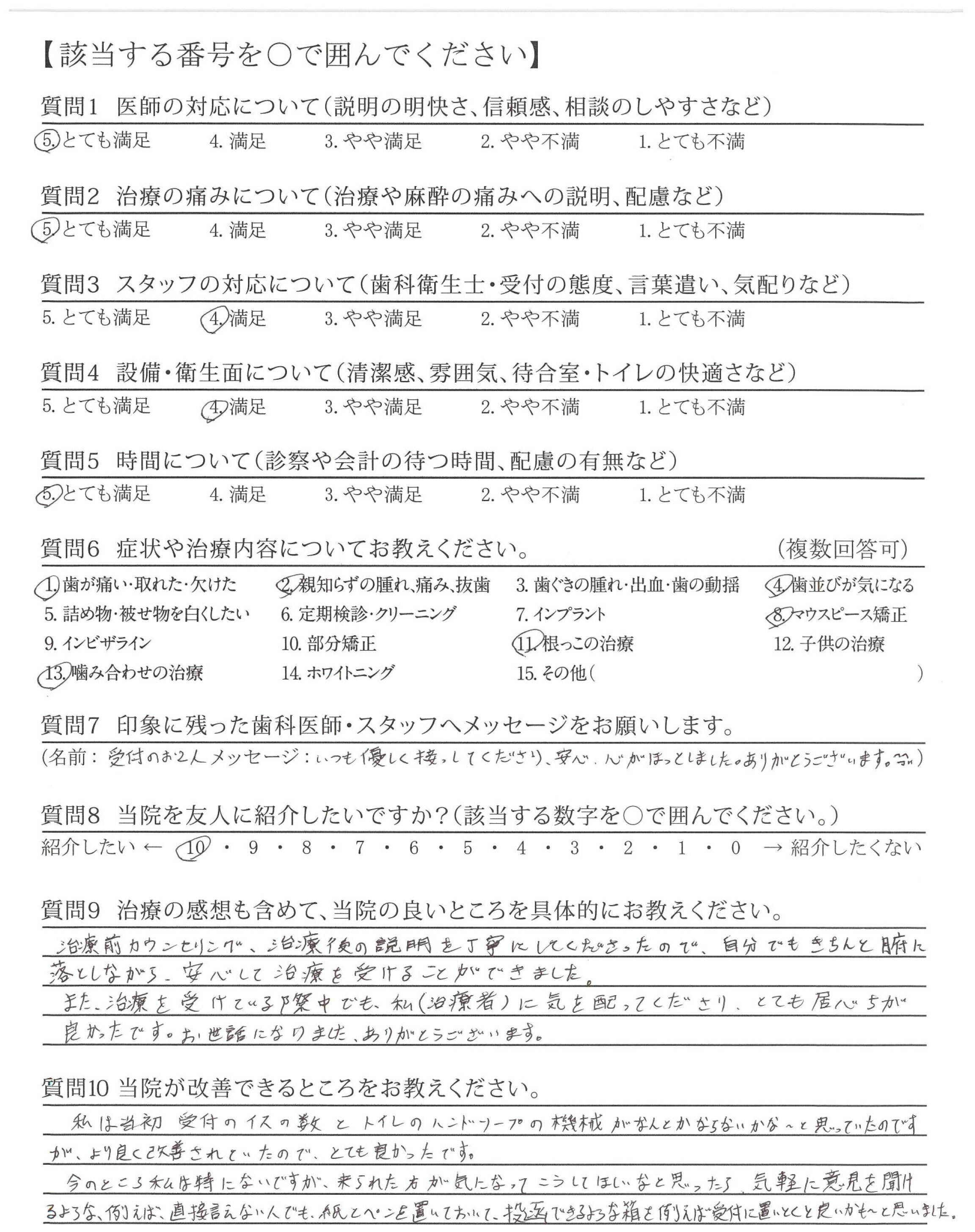 治療前カウンセリング、治療後の説明を丁寧にしてくださったので、自分でもきちんと腑に落としながら、安心して治療を受けることができました。また、治療を受けている際中でも、私(治療者)に気を配ってくださり、とても居心ちが良かったです。お世話になりました。ありがとうございます。
