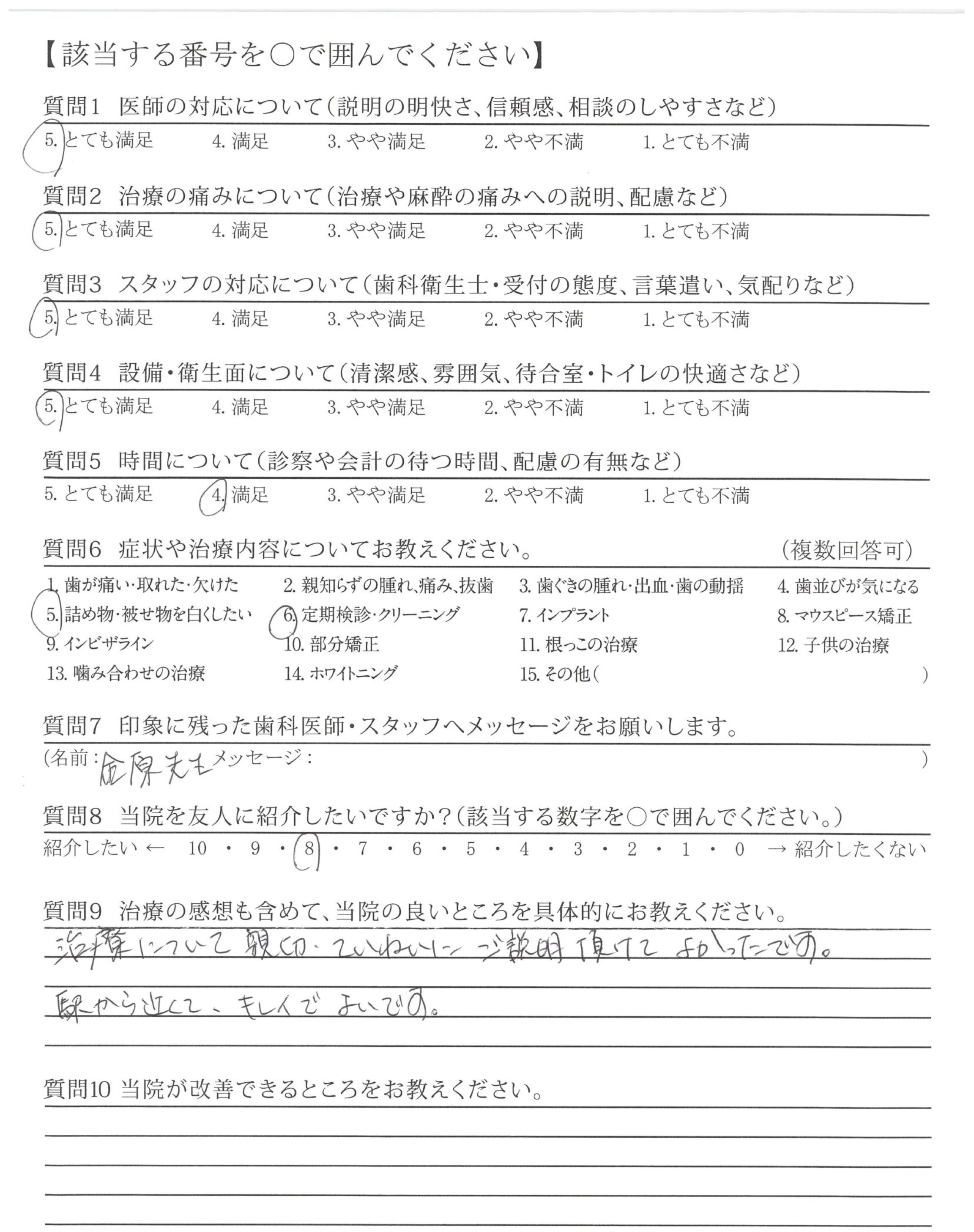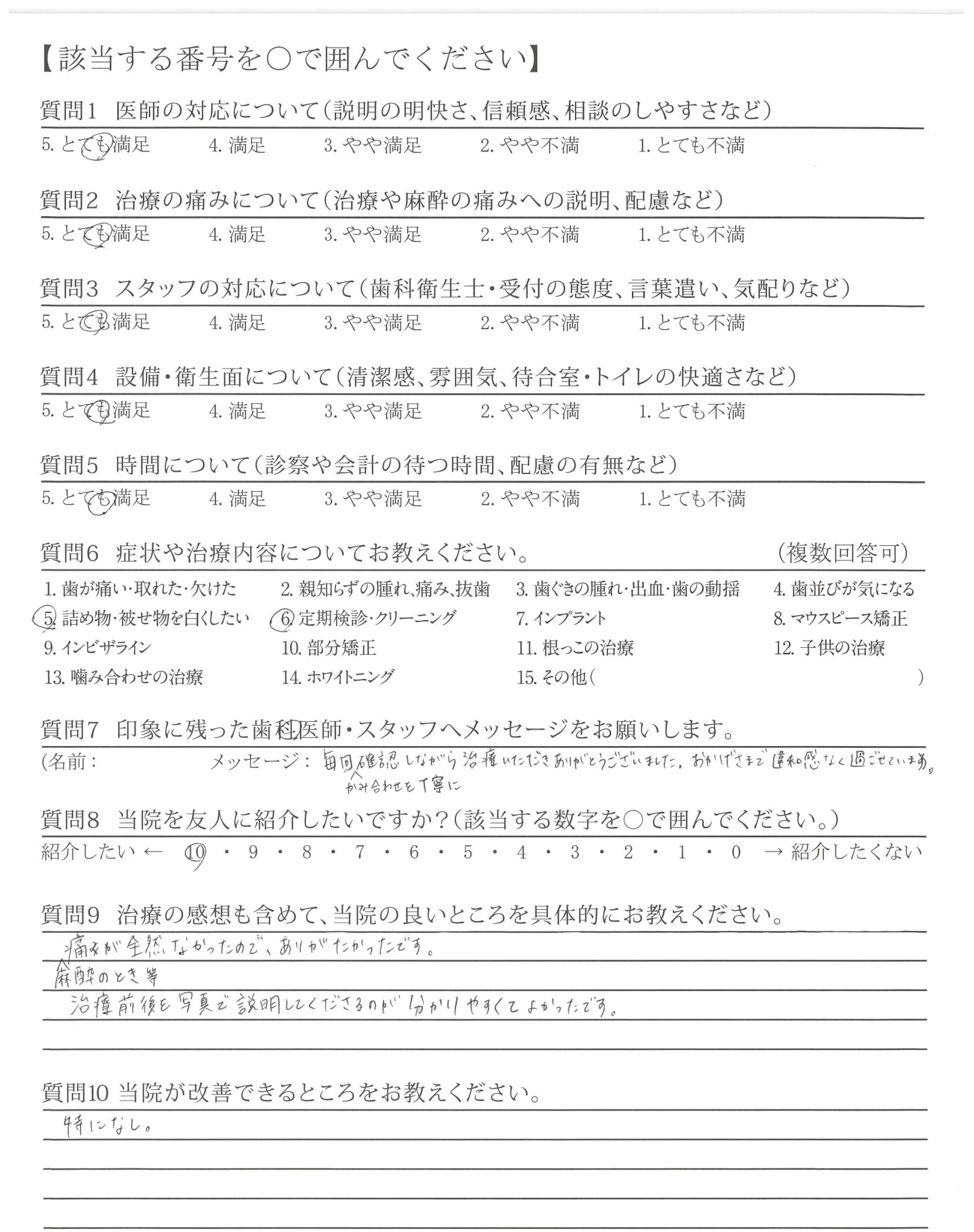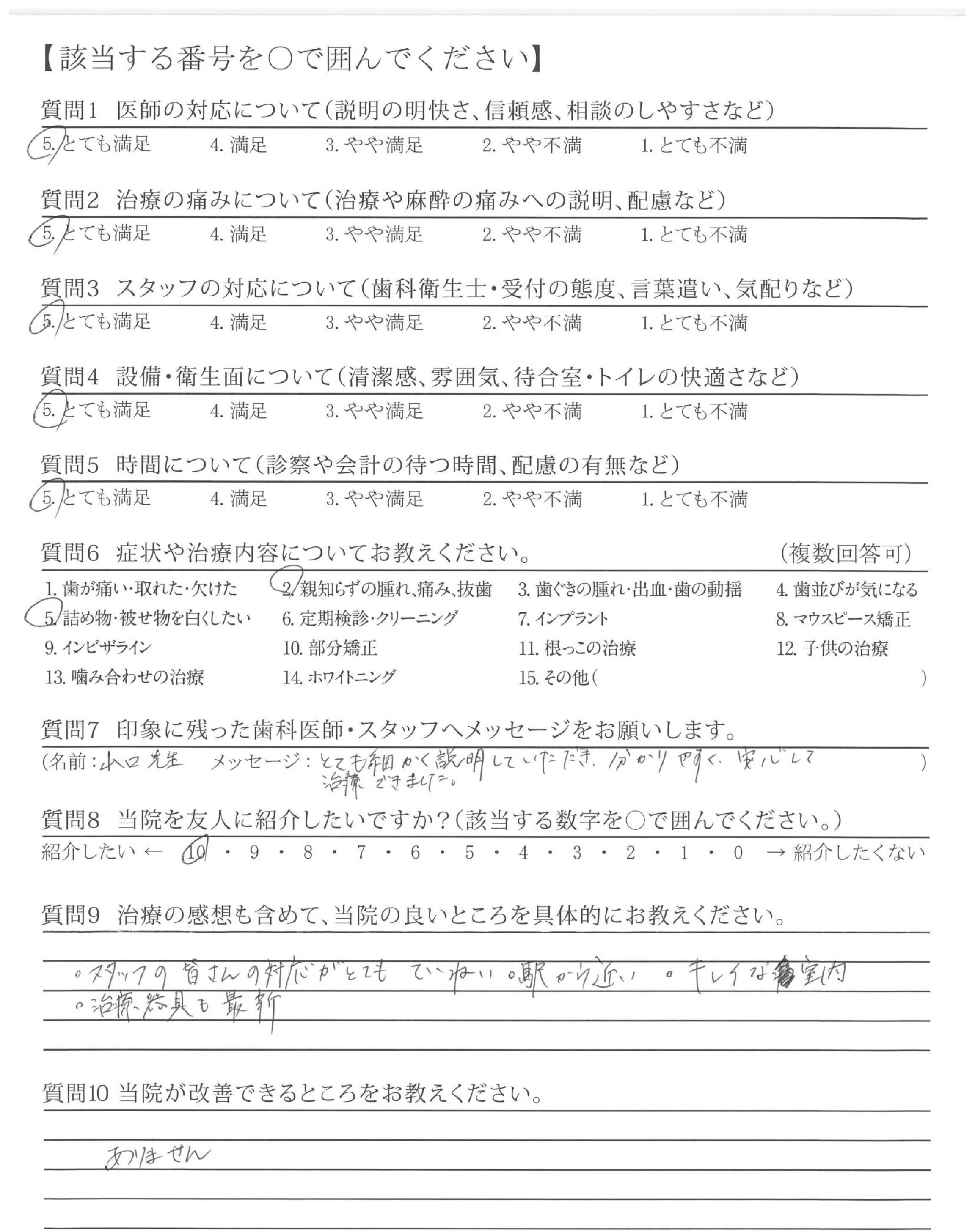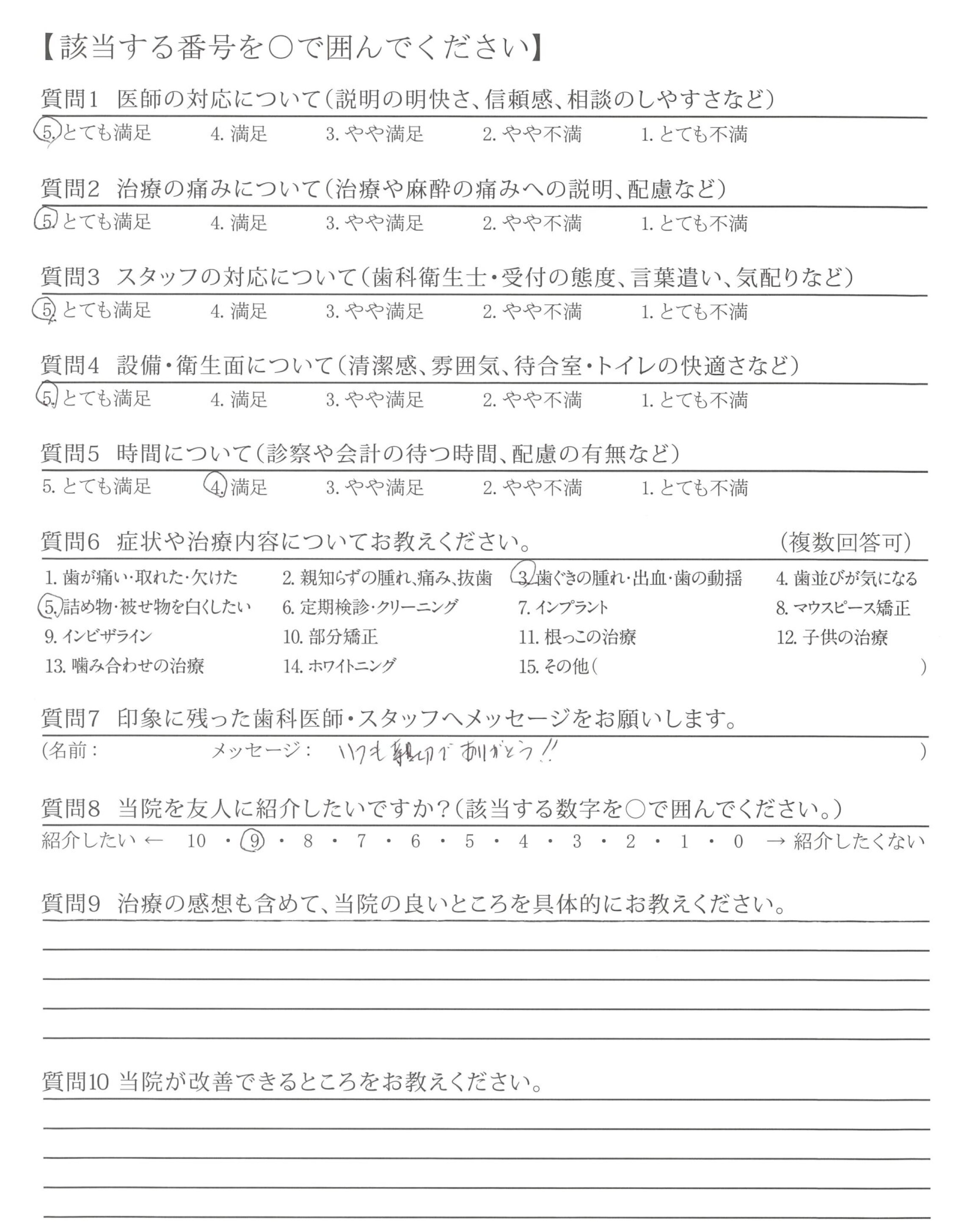 毎回かみ合わせを丁寧に確認しながら治療いただきありがとうございました。おかげさまで違和感なく過ごせています。