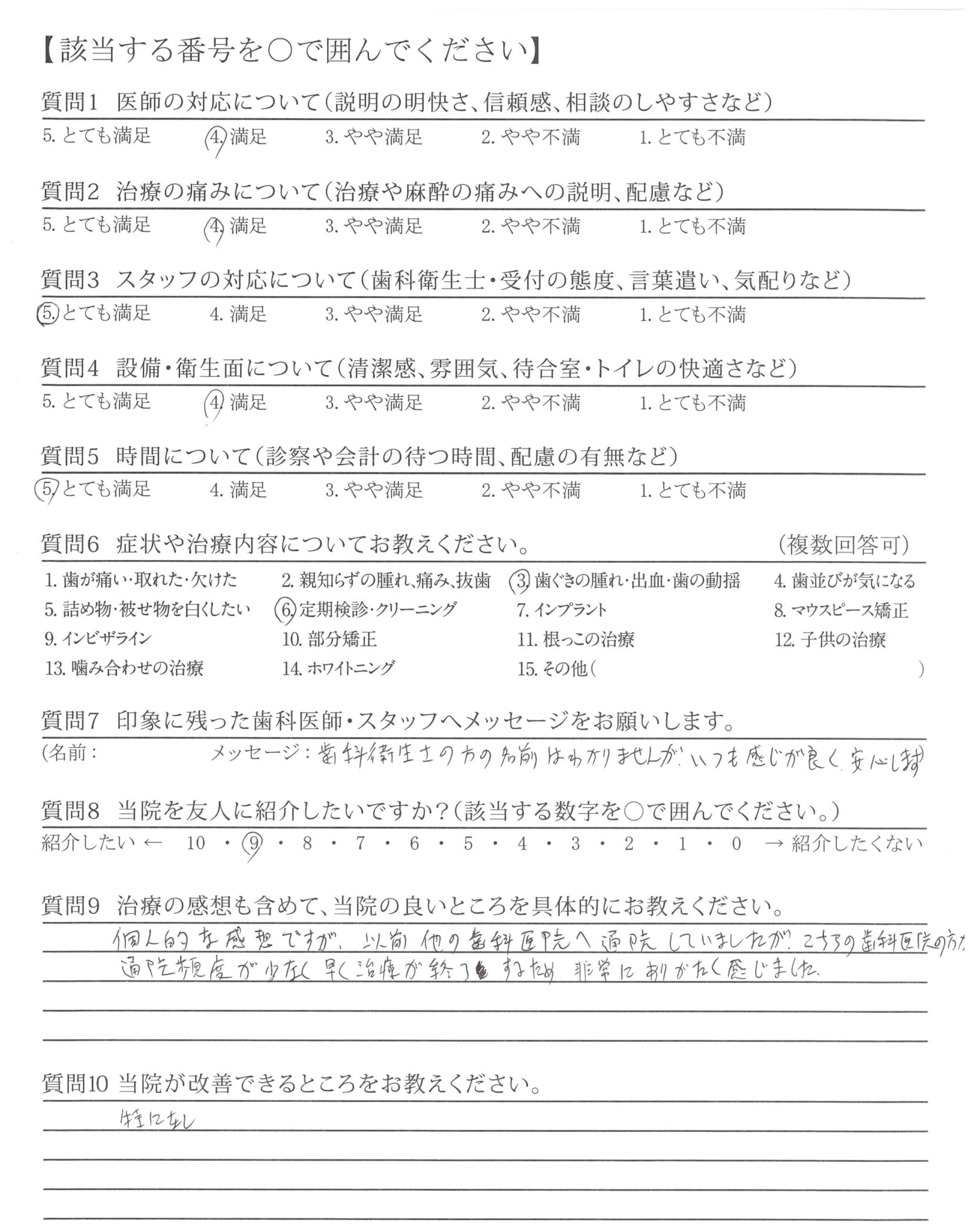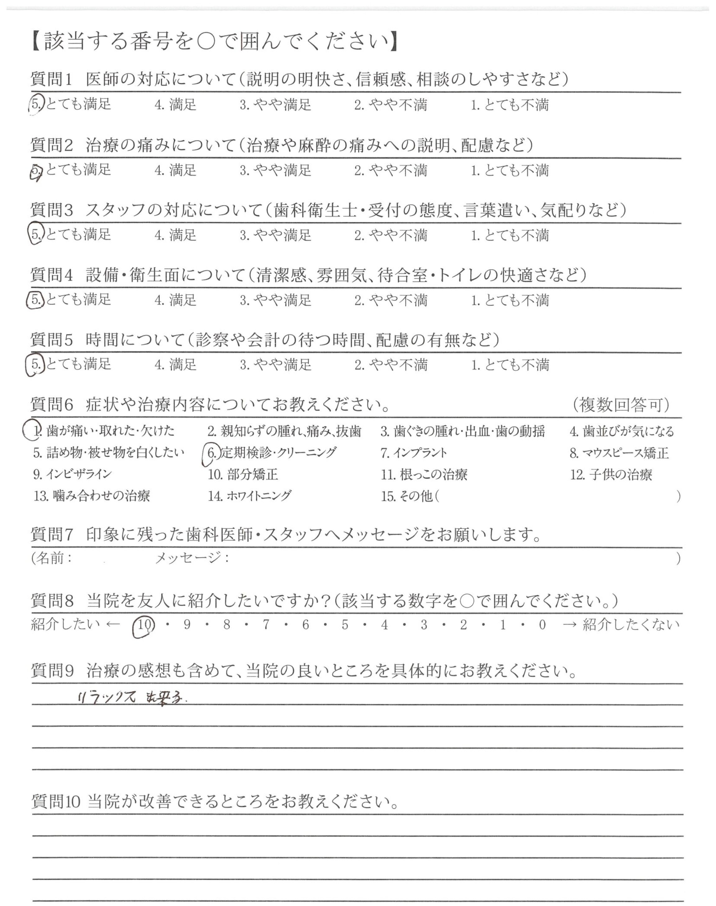 治療の行程をやさしく説明して下さり、治療後も違和感なく快適です。歯みもほとんどありませんでした。ありがとうございました。