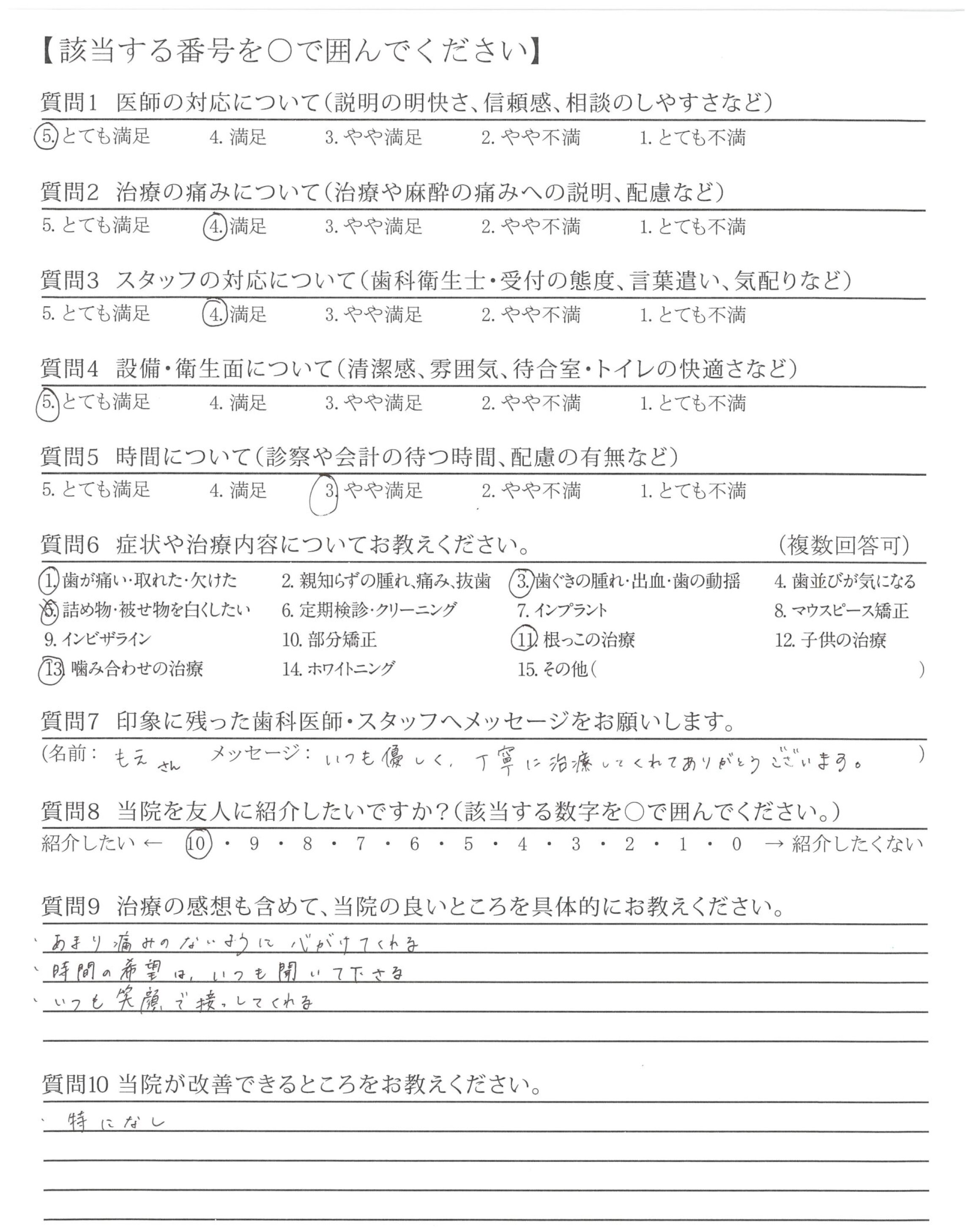 待ち時間もなく、いつも時間どおりにして頂けて、丁寧に対応して下さいまして痛みもなく継続できる所がとても通いやすいです。