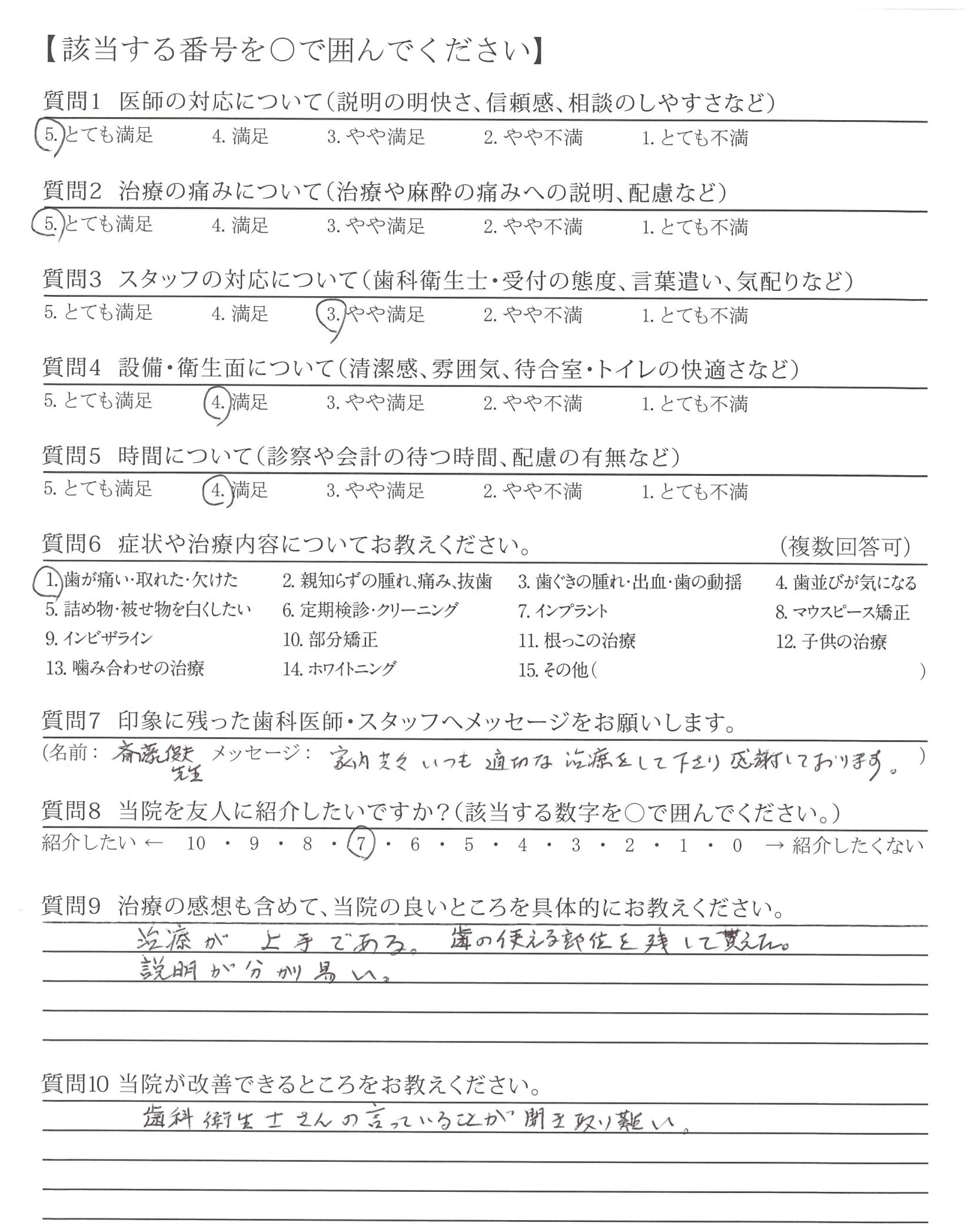 ・歯のクリーニングをしていただく際、普段の歯みがきの仕方について少しですが話気が強い様に感じた事がありました。うまく出来ないのでクリーニングをしていますので、その点を考慮していただければと思います。