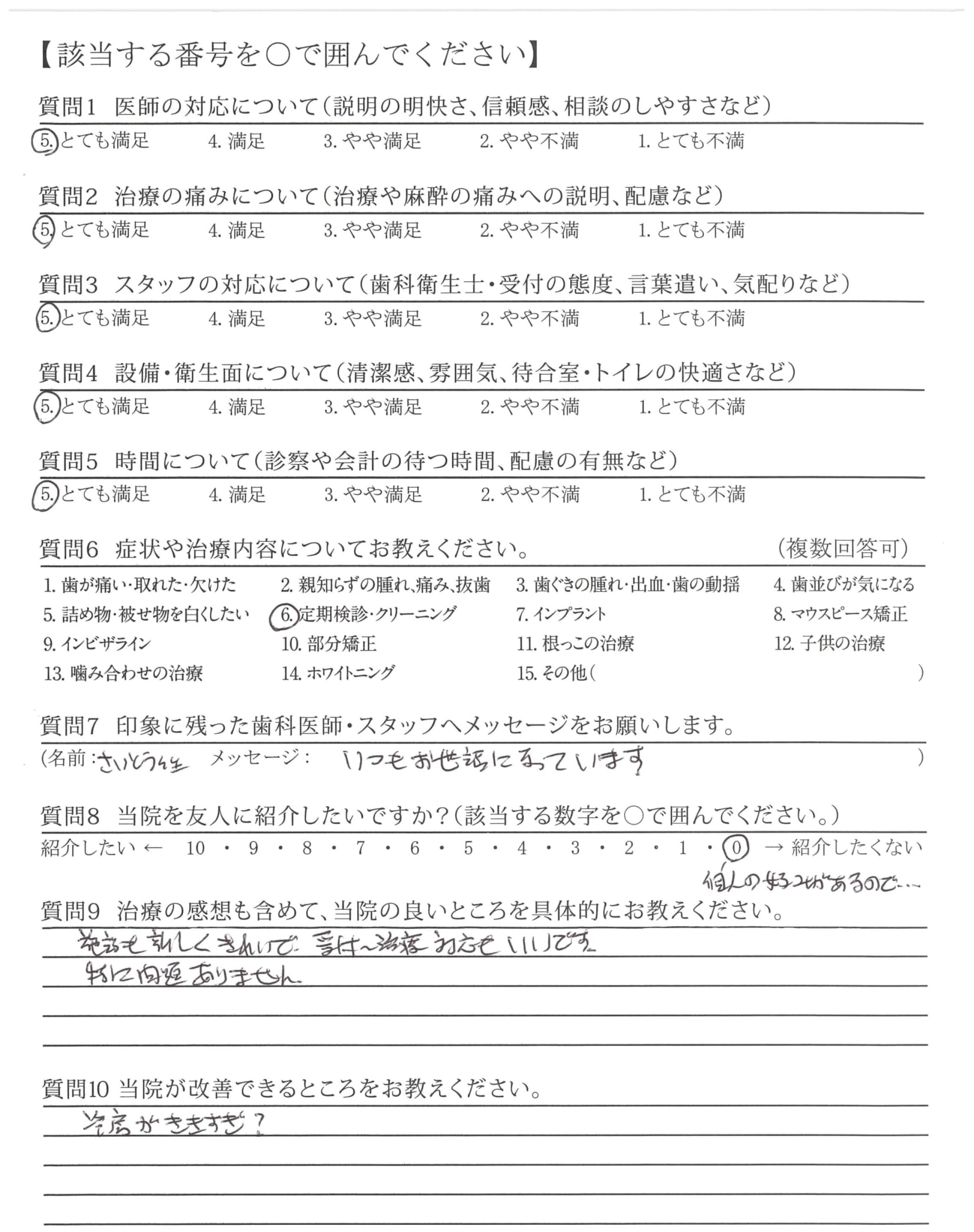 今のところ特になし。引き続き同じ医師に治療して頂きたい。